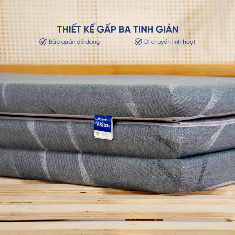 Là một trong số ít dòng nệm foam có thiết kế gấp 3, nệm Akita gọn nhẹ và tiện lợi tiện lợi cho việc vận chuyển và cất trữ, giúp tiết kiệm tối đa diện tích phòng ngủ và bảo quản dễ dàng hơn.