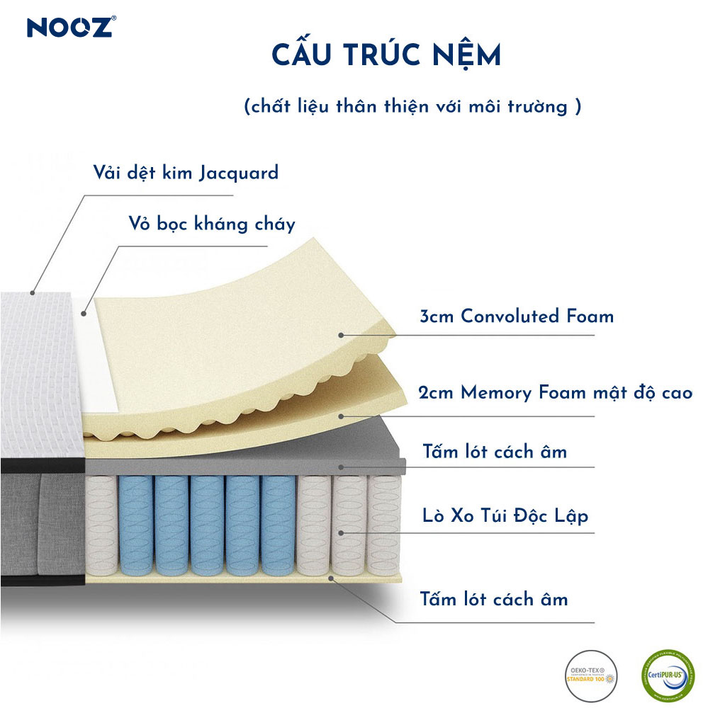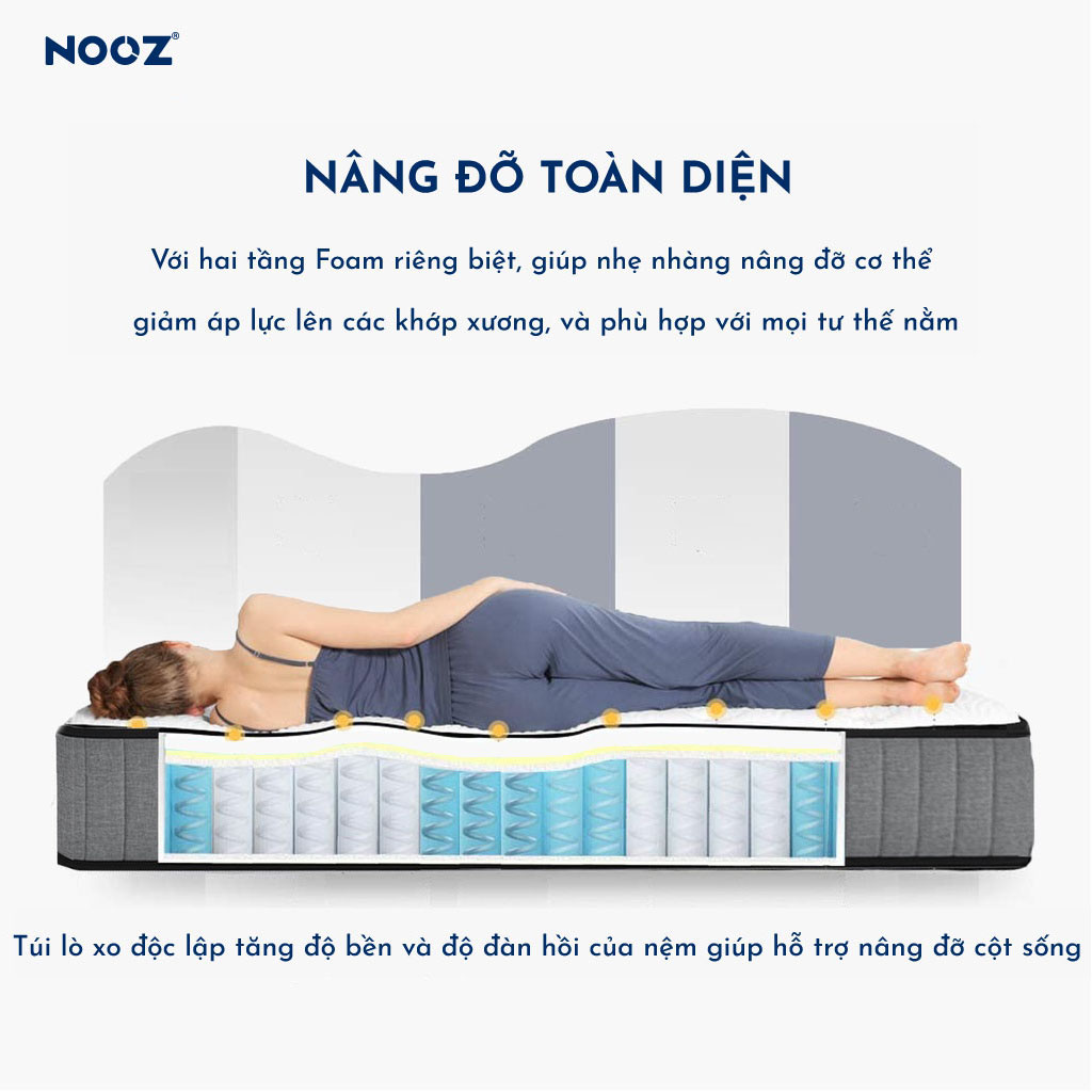 ✨Nệm Foam Hybrid 25cm Nooz Home Goods Tiêu Chuẩn CertiPUR-US Ruột Đệm Lò Xo Túi Độc Lập Kết Hợp Cùng 2 Tầng Cao Su Non (Convulated Foam và High Density Foam)