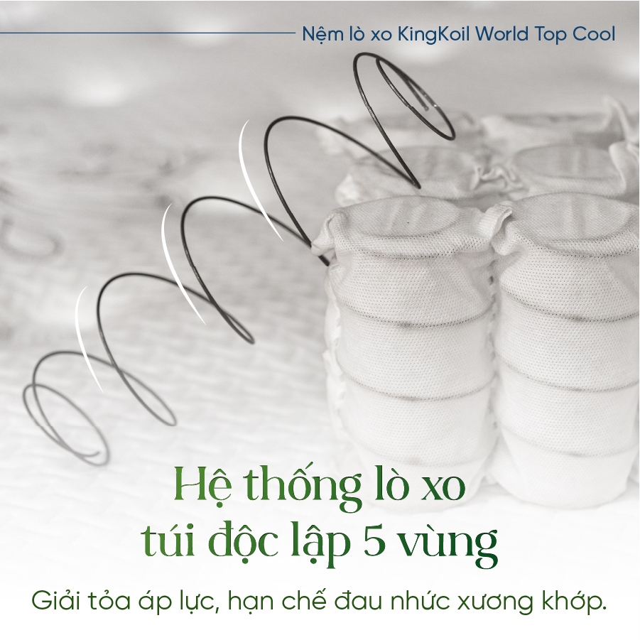 Mua tại TiktokThông tin sản phẩm WORLD SERIES - Bộ sưu tập nệm lò xo King Koil được phân phối độc quyền tại Thế Giới Nệm hứa hẹn đem tới cho người dùng một giấc ngủ ngon và sâu, đáp ứng các tiêu chuẩn lâm sàng của ICA - Hiệp Hội Các Bệnh Cột Sống Và Xương Khớp Quốc Tế về hỗ trợ và bảo vệ cột sống của người nằm, đem lại tư thế ngủ đúng chuẩn. Chúng tôi vận chuyển miễn phí NỘI THÀNH các khu vực: Tp.HCM ( trừ Cần Giờ), Nội thành các quận Tp.Hà Nội. Đồng Nai (Tp. Biên Hòa, Long Thành ), Bình Dương ( Dĩ An, Thuận An, Thủ Dầu Một), Tp. Cần Thơ, An Giang(Tp. Long Xuyên), Tp. Vũng Tàu , Đắk Lắk (Tp.Buôn Ma Thuột), Bình Phước (Tp Đồng Xoài) Khánh Hòa (Tp. Nha Trang) , Kiên Giang (Tp. Rạch Giá) , Bình Thuận (Tp. Phan Thiết). - Hỗ trợ 50% phí vận chuyển ở các khu vực tỉnh khác. - Anh/Chị vui lòng liên hệ shop để được hỗ trợ chi tiết. Ưu điểm nội bật của nệm lò xo King Koil World Top Cool