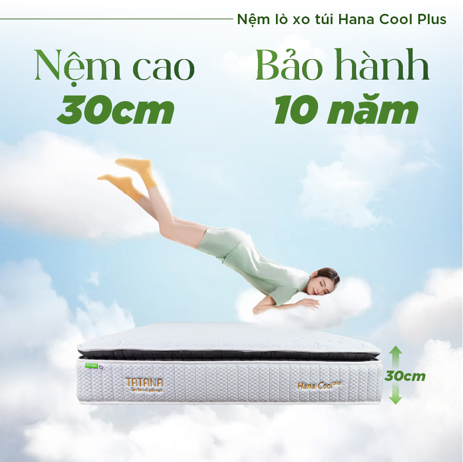 ✨Nệm lò xo túi cao cấp Hana Cool Plus Tatana, Thiết kế sang trọng, khung lò xo vững chắc, êm ái độ đàn hồi cao - Độ dày 30cm
