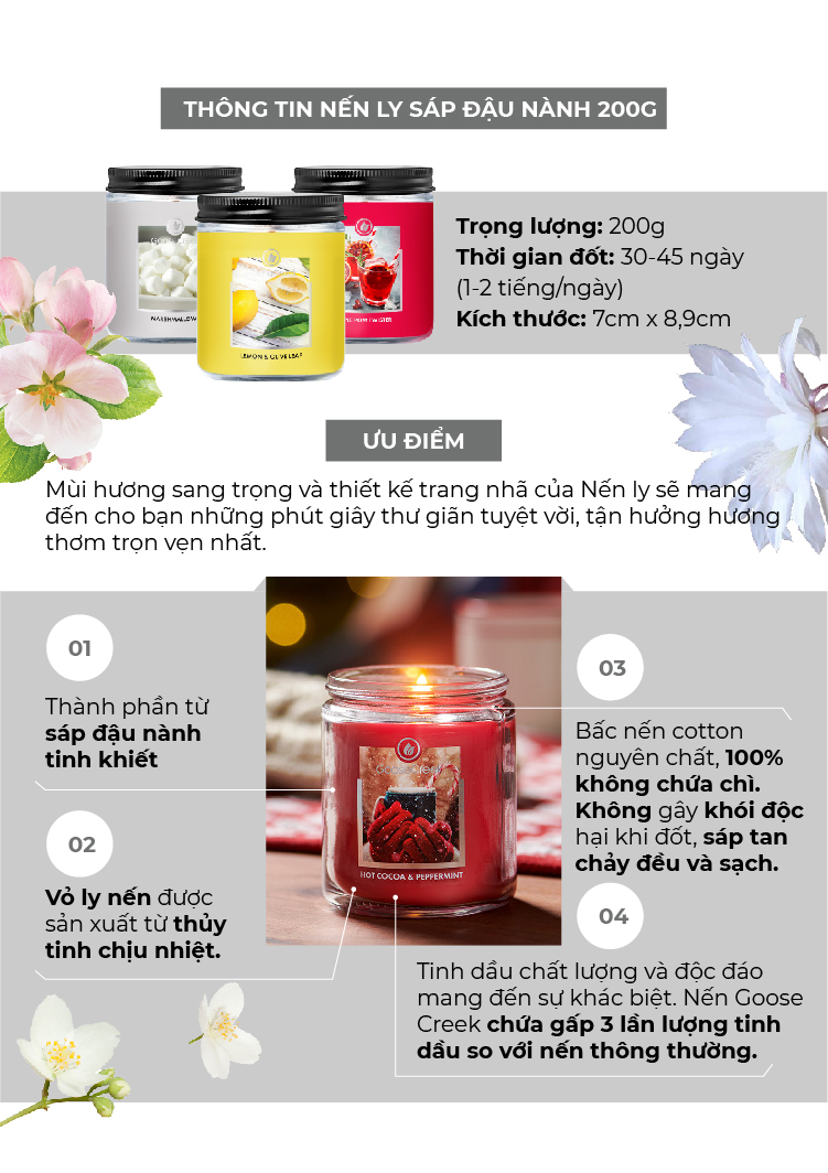 - Trọng lượng: 115g, thời gian cháy 40-60 giờ liên tục. - Hương thơm tinh dầu thiên nhiên, an toàn cho sức khỏe, và môi trường đáp ứng tiêu chuẩn nghiêm ngặt của Châu Âu.