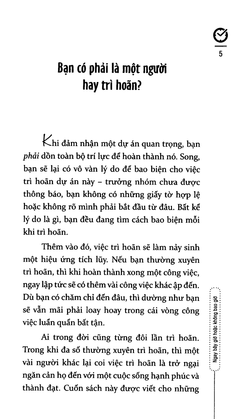 Ngay Bây Giờ Hoặc Không Bao Giờ (Tái Bản) Ngay bây giờ hoặc không bao giờ sẽ giúp bạn khám phá ra hàng loạt ý tưởng giúp bản thân vượt qua sự trì hoãn hằng ngày. Trong khi nhiều cuốn sách khác chỉ cung cấp những mẹo mực đơn giản, thì với cuốn sách này, bạn sẽ biết được tại sao một chiến lược lại trở nên hiệu quả, nó loại bỏ những hạn chế và niềm tin nào và bằng cách nào chiến lược ấy có thể được ứng dụng tức thì vào cuộc sống của bạn… Thành công chỉ thực sự đến khi bạn giữ một lòng kiên trì sắt đá với những mục tiêu đã được đặt ra. Trong cuốn sách này, J. S. Scott đã cung cấp chi tiết những kế hoạch hành động trên mọi lĩnh vực của cuộc sống hằng ngày: từ chăm sóc sức khỏe, thể dục, công việc cho tới các mối quan hệ cá nhân. Không giống như các cuốn sách rèn luyện kỹ năng tầm thường khác, nội dung cuốn sách tập trung tối đa vào hai chữ “hành động”. Vì vậy, thay vì phải đọc những lời khuyên chung chung, bạn sẽ nhận được những phương pháp có thể được thực hiện ngay lập tức nhằm tạo lập những thói quen có thể đánh bại sự trì hoãn .