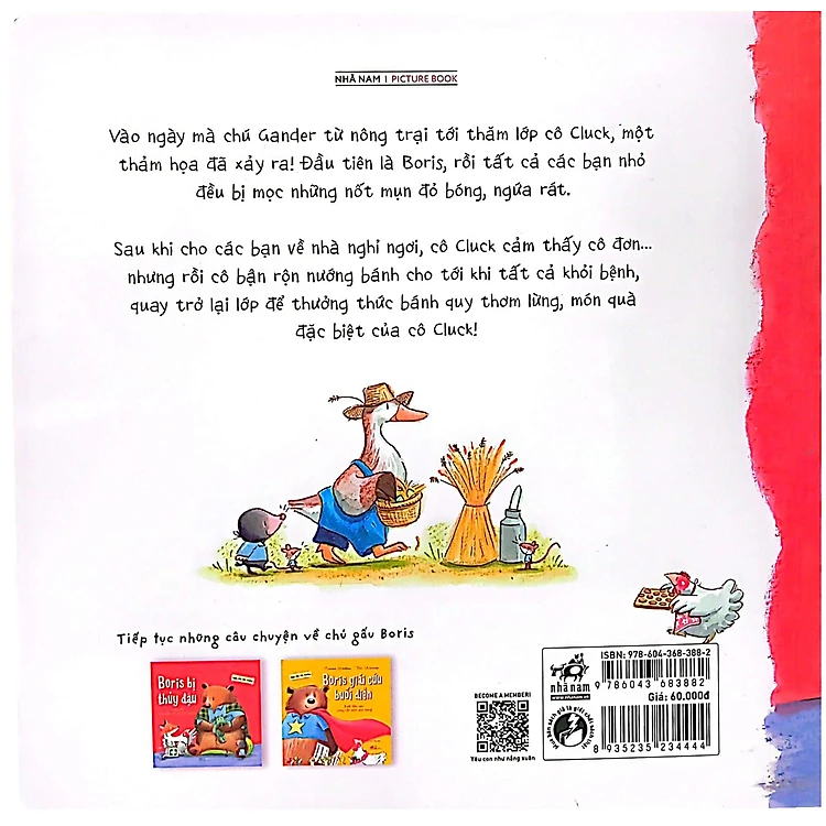 Cuốn sách kể về một ngày đáng nhớ nhưng cũng đầy bất ngờ trong lớp học của cô gà mái Cluck. Vào ngày mà chú Gander từ nông trại đến thăm lớp, một sự cố hy hữu đã xảy ra: Boris, một chú gà con tinh nghịch, đã bị thủy đậu. Không dừng lại ở đó, căn bệnh này nhanh chóng lây lan sang tất cả các bạn nhỏ trong lớp. Những nốt mụn đỏ ngứa ngáy khiến các bạn gà con cảm thấy khó chịu và không thể đến trường. Cô Cluck, dù buồn vì không có các học trò bên cạnh, vẫn luôn quan tâm và chăm sóc các bạn bằng cách nướng những chiếc bánh quy thơm ngon. Cô tin rằng, tình yêu thương và sự ấm áp sẽ giúp các bạn vượt qua giai đoạn khó khăn này.