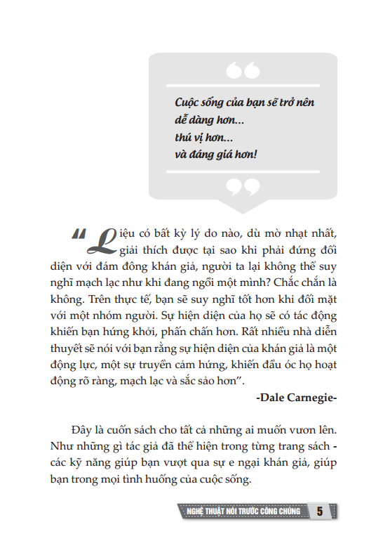Giao tiếp là nghệ thuật có ảnh hưởng lớn đến hàng triệu cá nhân trong xã hội từ những diễn giả, chính trị gia, nhà quản lý đến học sinh, sinh viên hay nhân viên bán hàng… Nghệ thuật nói trước công chúng là một tác phẩm xuất sắc về giao tiếp, chinh phục công chúng của Dale Carnegie – tác giả cuốn Đắc nhân tâm nổi tiếng. Những phương pháp giao tiếp, diễn thuyết có giá trị thực tiễn trong tác phẩm sẽ mang lại cho bạn mối quan hệ bạn bè, khách hàng tốt hơn trong công việc và cuộc sống.