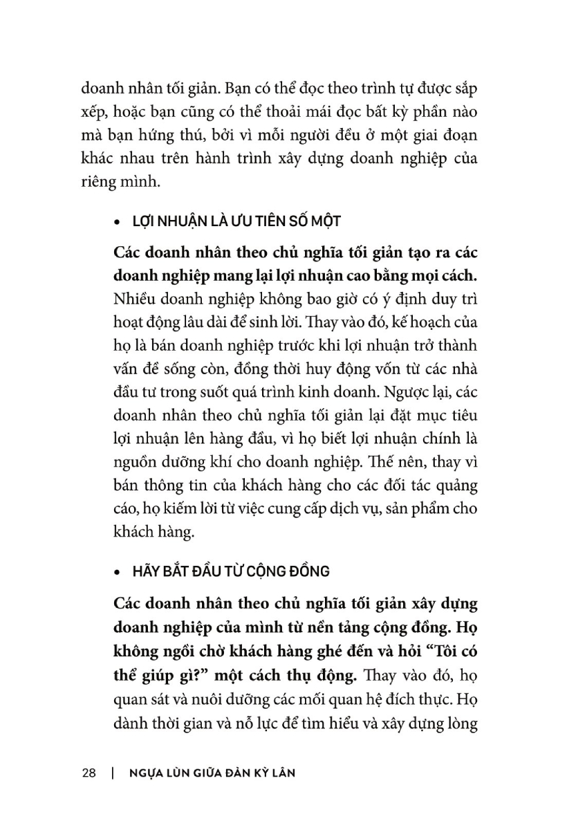 Nhiều nhà kinh doanh và những người đang có ý định khởi nghiệp cũng đã trải qua quá trình tự hỏi bản thân rất nhiều và kết quả là đi đến cùng một kết luận. Bạn sẽ bắt gặp nhiều câu chuyện của họ trong cuốn sách Ngựa Lùn Giữa Đàn Kỳ Lân. Trong sách, họ được gọi là những “doanh nhân tối giản” và gọi công ty của họ là “doanh nghiệp tối giản”.