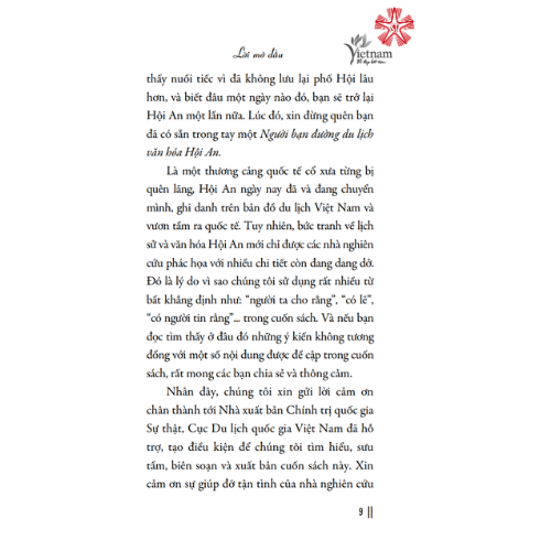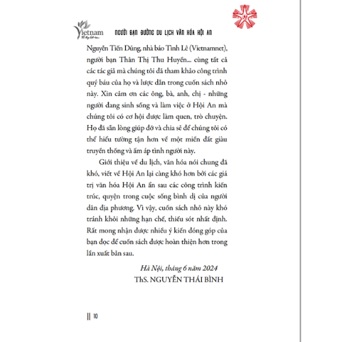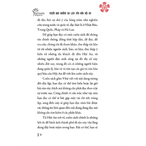 Từ Hội An trở về, cuốn sách chính là những hồi ức để hình ảnh thành phố di sản này vẫn lắng đọng đầy hoài niệm trong bạn. Rất có thể, bạn sẽ thấy nuối tiếc vì đã không lưu lại phố Hội lâu hơn, và biết đâu một ngày nào đó, bạn sẽ trở lại Hội An một lần nữa. Lúc đó, xin đừng quên bạn đã có sẵn trong tay một Người bạn đường du lịch văn hóa Hội An.