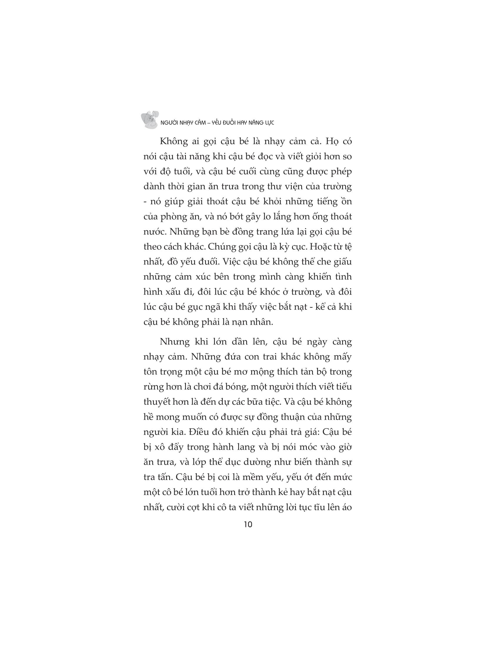 Người nhạy cảm đều có quyền lựa chọn con đường riêng của họ. Nhưng có một bước mà tất cả chúng ta đều phải thực hiện và nó là bước khó khăn nhất: ngưng nhìn nhận sự nhạy cảm là một khiếm khuyết và bắt đầu coi nó là một món quà. Cuốn sách chứa đầy cảm hứng này sẽ thay đổi mãi mãi cách chúng ta nhìn nhận những người nhạy cảm và cách họ nhìn nhận chính m.ình.