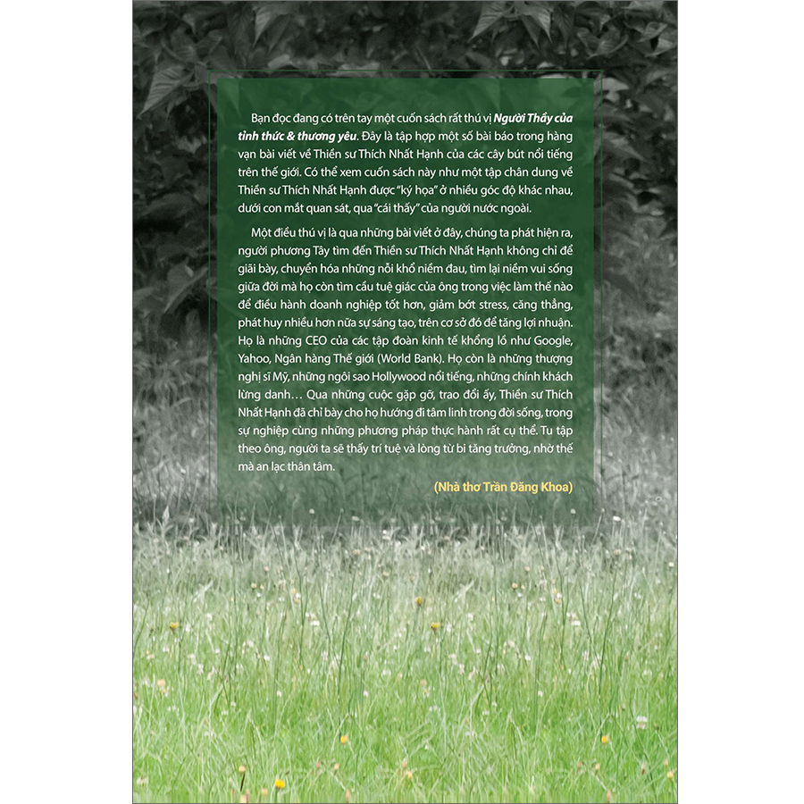 Bạn đọc đang có trên tay một cuốn sách rất thú vị Người Thầy của tỉnh thức & thương yêu. Đây là tập hợp một số bài báo trong hàng vạn bài viết về Thiền sư Thích Nhất Hạnh của các cây bút nổi tiếng trên thế giới. Có thể xem cuốn sách này như một tập chân dung về Thiền sư Thích Nhất Hạnh được “ký họa” ở nhiều góc độ khác nhau, dưới con mắt quan sát, qua “cái thấy” của người nước ngoài.