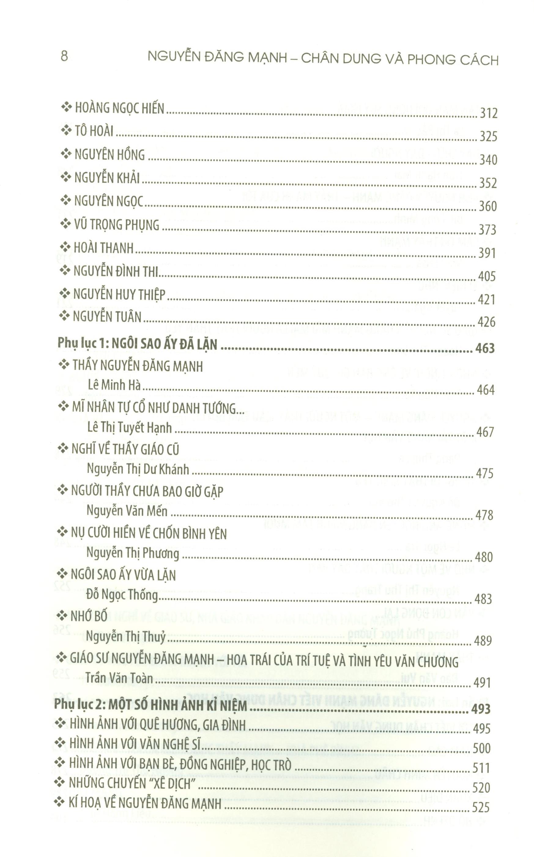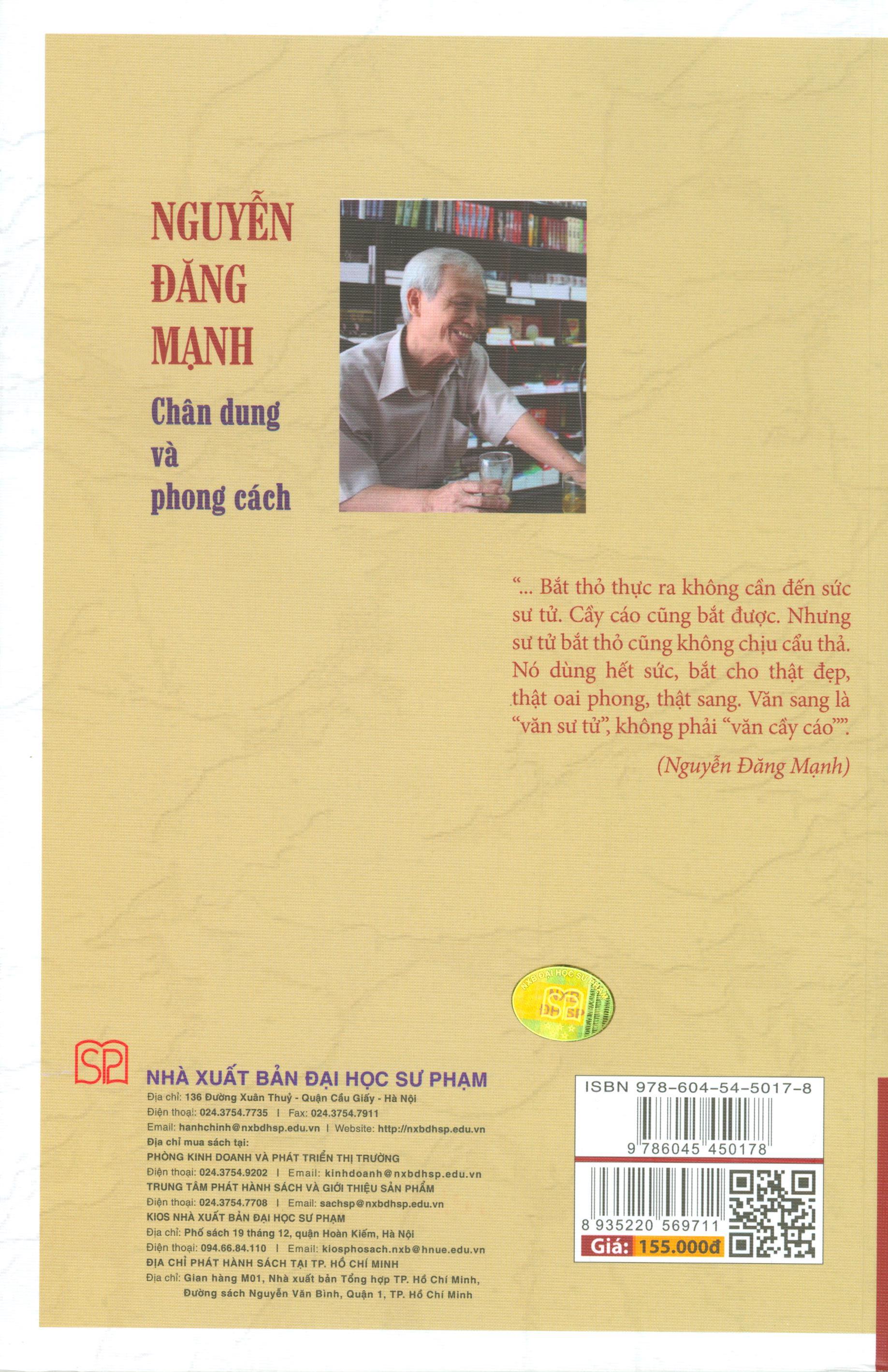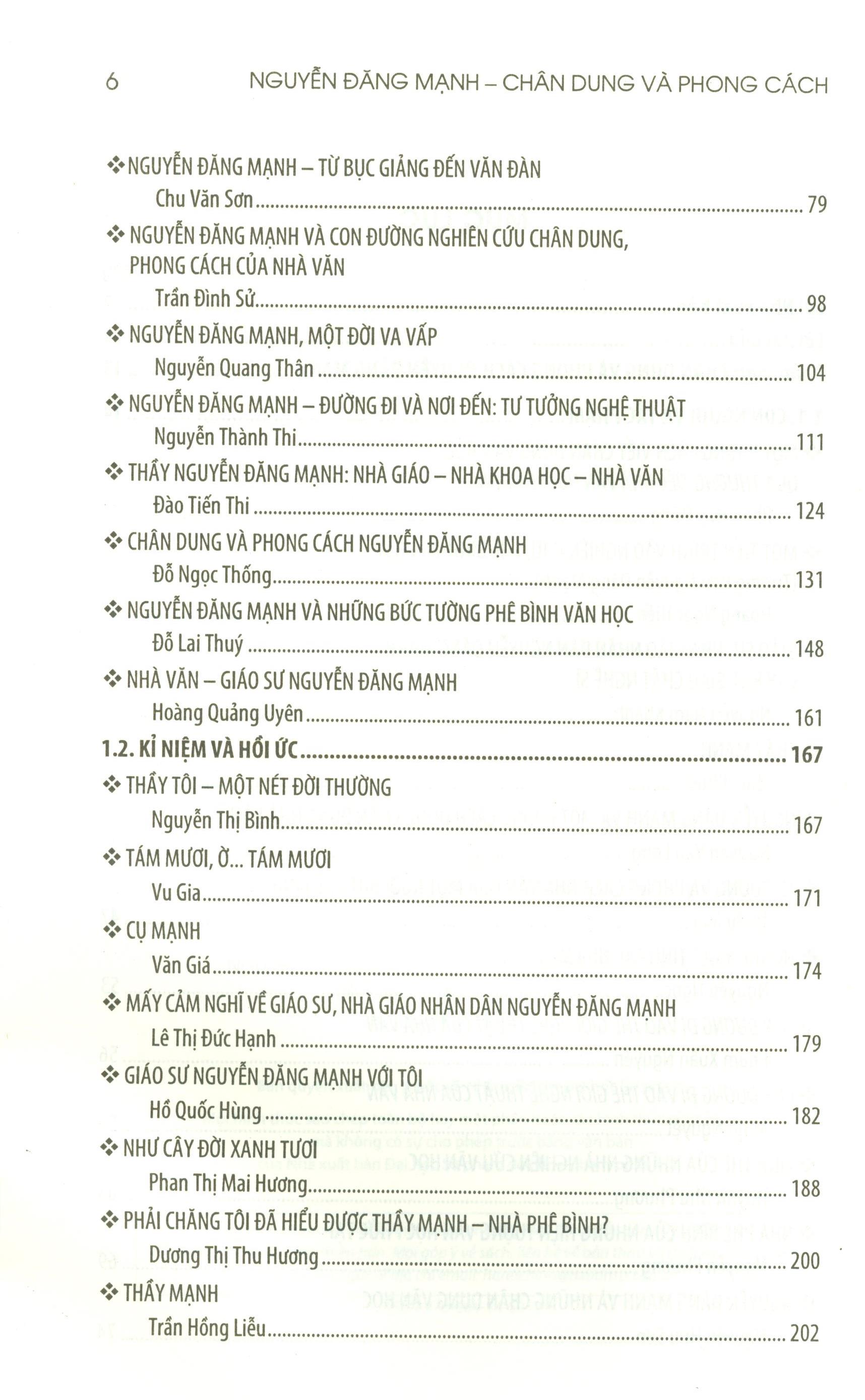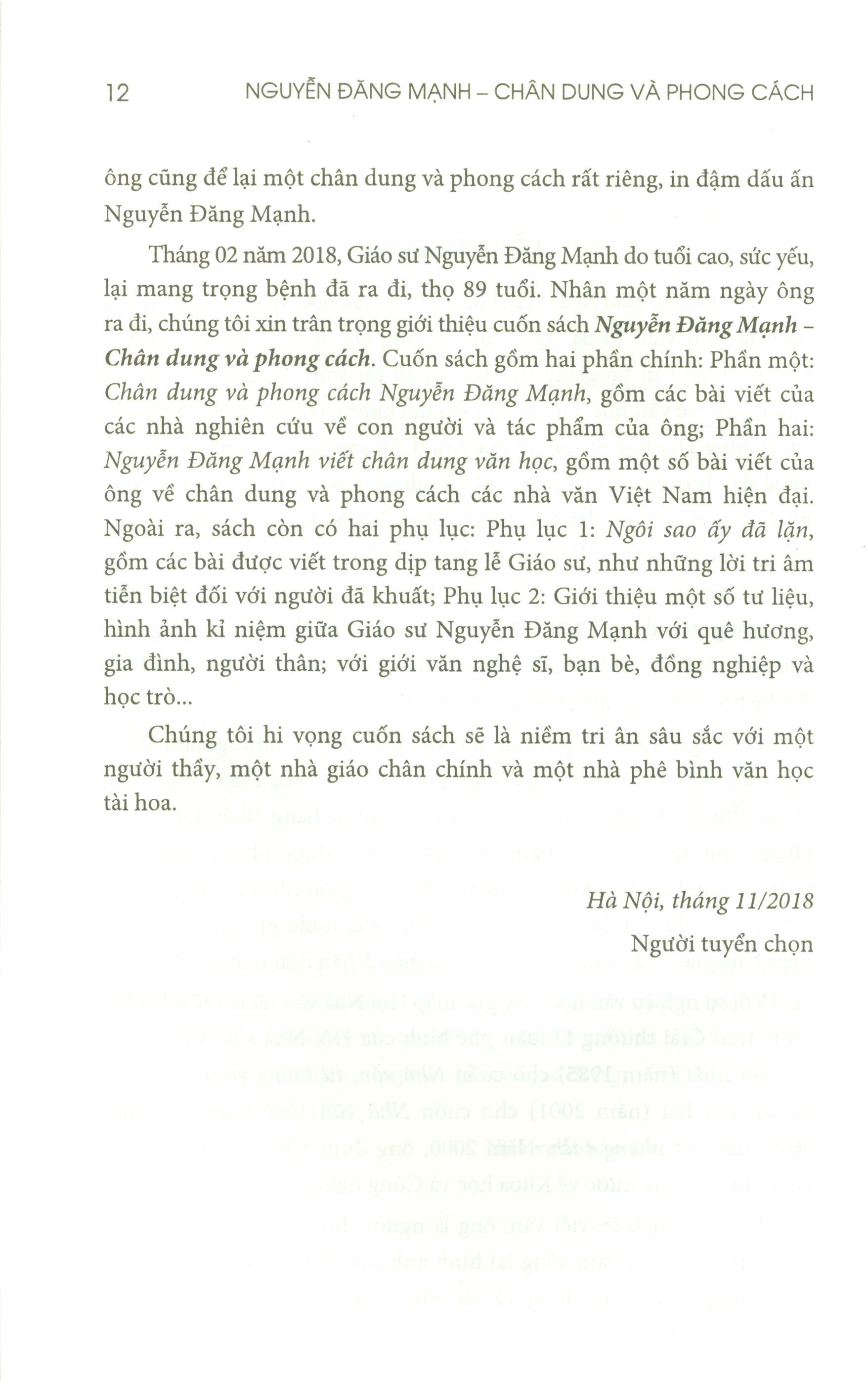 Mua tại TiktokNội dung gồm có: Phần một: Chân dung và phong cách Nguyễn Đăng Mạnh 1. Con người và tác phẩm 2. Kỉ niệm và hồi ức Phần hai: Nguyễn Đăng Mạnh viết chân dung văn học Phụ lục 1: Ngôi sao ấy đẫ lặn Phụ lục 2: Một số hình ảnh kỉ niệm