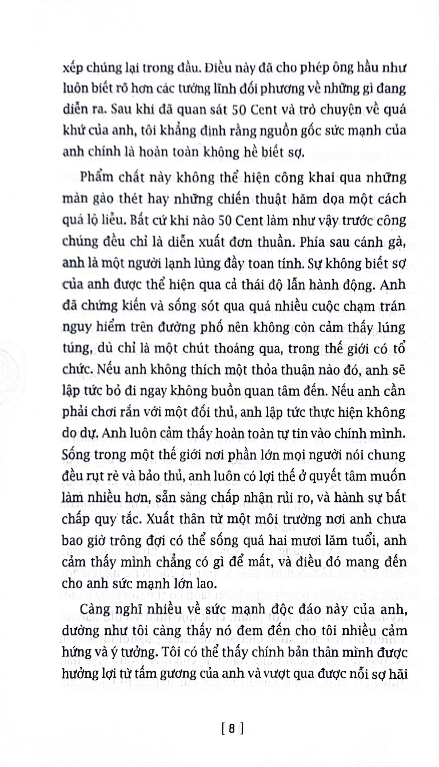 Sợ hãi là một trong những cảm xúc nguyên thủy nhất mà mỗi người cảm nhận được ngay từ lúc chào đời. Không ai thoát khỏi quy luật chung này. Vì vậy, vượt qua sợ hãi, với tất cả hình thức cung bậc đa dạng của nó, không phải là điều tự nhiên đến mà là kết quả của một quá trình nỗ lực kiên trì, có ý thức, có phương pháp. Robert Greene đã trình bày trong cuốn sách của m.ình, thông qua 10 chương sách, 10 chiến lược hành động khác nhau để vượt qua những khía cạnh khác nhau của cảm giác sợ hãi. Những gì được viết ra trong cuốn sách không phải là điều gì mới lạ do tác giả phát minh ra, mà đơn thuần chỉ là sự tổng kết có hệ thống những phương cách mà nhiều nhân vật nổi tiếng trong lịch sử thuộc mọi lĩnh vực - từ chính trị, quân sự đến kinh doanh, từ thể thao đỉnh cao đến nghiên cứu khoa học – đã áp dụng thành công để vượt qua nỗi sợ hãi của chính họ nhằm tiến tới thành công. Bên cạnh những khuôn mặt nổi tiếng trong lịch sử, Greene dẫn dắt bạn đọc theo con đường vươn lên của ca sĩ nổi tiếng 50 Cent từ một đứa trẻ lang thang bán túy trên đường phố trở thành ông chủ đầy quyền lực của một đế chế kinh doanh phát đạt, cũng như cách mà anh vượt qua những thử thách mới, những nỗi sợ hãi mới gặp phải trong mỗi giai đoạn của cuộc sống.