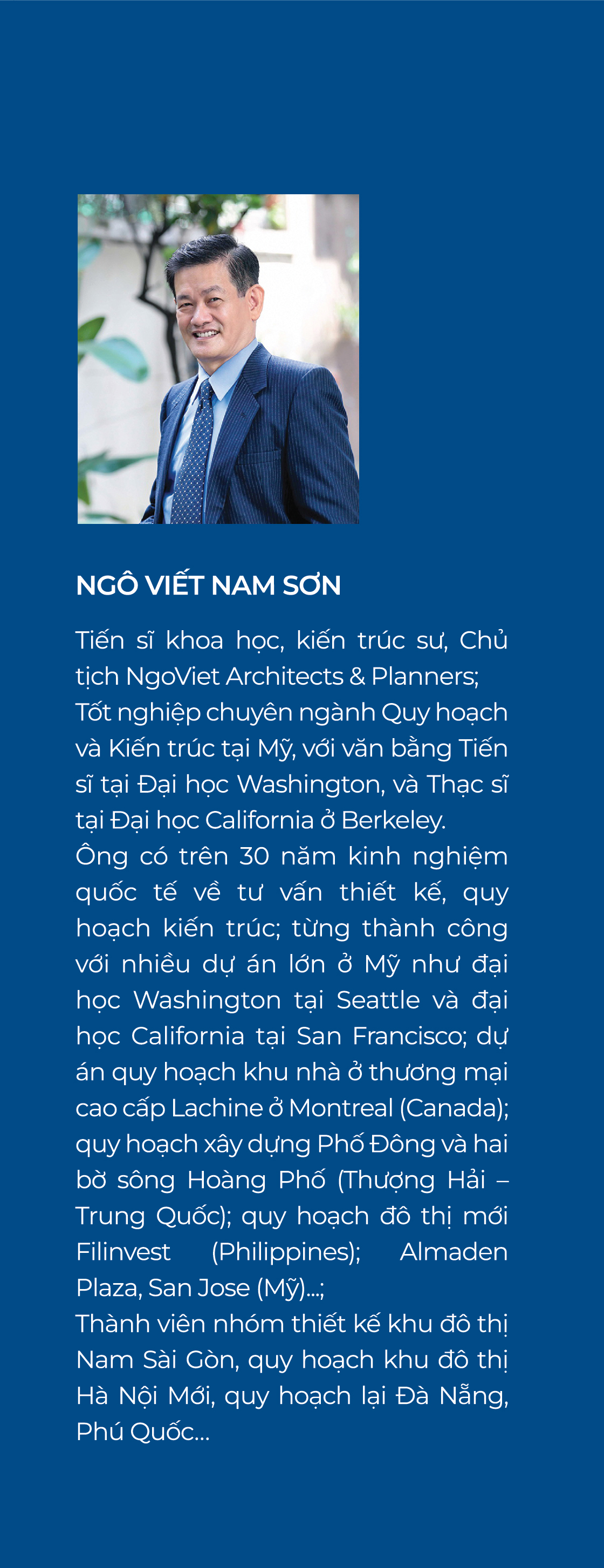 THÔNG TIN TÁC GIẢ NGÔ VIẾT NAM SƠN Tiến sĩ khoa học, kiến trúc sư, Chủ tịch NgoViet Architects & Planners; Tốt nghiệp chuyên ngành Quy hoạch và Kiến trúc tại Mỹ, với văn bằng Tiến sĩ tại Đại học Washington, và Thạc sĩ tại Đại học California ở Berkeley. Ông có trên 30 năm kinh nghiệm quốc tế về tư vấn thiết kế, quy hoạch kiến trúc; từng thành công với nhiều dự án lớn ở Mỹ như đại học Washington tại Seattle và đại học California tại San Francisco; dự án quy hoạch khu nhà ở thương mại cao cấp Lachine ở Montreal (Canada); quy hoạch xây dựng Phố Đông và hai bờ sông Hoàng Phố (Thượng Hải Trung Quốc); quy hoạch đô thị mới Filinvest (Philippines); Almaden Plaza, San Jose (Mỹ)…; Thành viên nhóm thiết kế khu đô thị Nam Sài Gòn, quy hoạch khu đô thị Hà Nội Mới, quy hoạch lại Đà Nẵng, Phú Quốc…