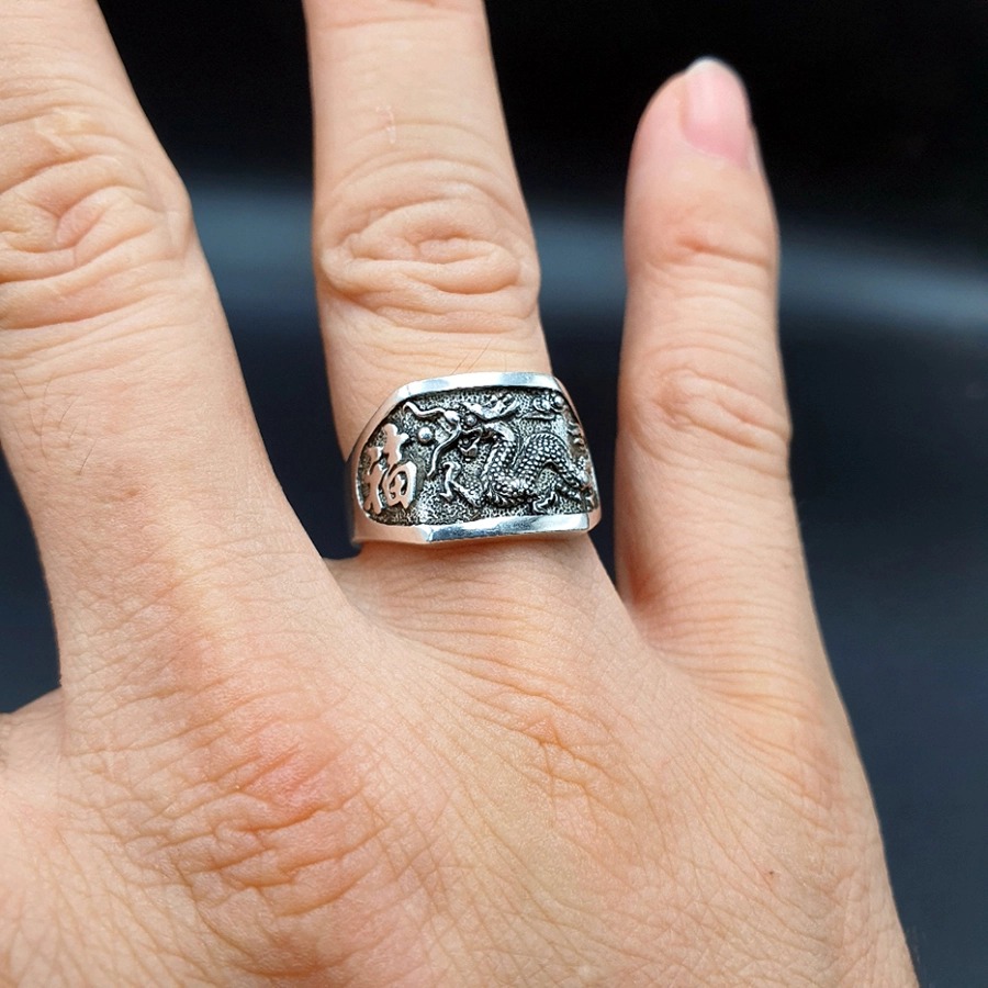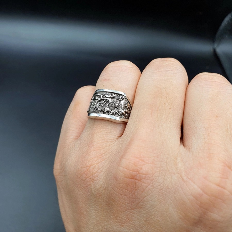 Chất liệu Thân Nhẫn: Hợp kim Titanium Chất liệu đá: Đá Zircon nhân tạo, kiểu dáng kim cương Thiết kế: Khắc rồng trên thân và mặt nhẫn, tinh xảo, chi tiết. Công dụng: Trang sức,