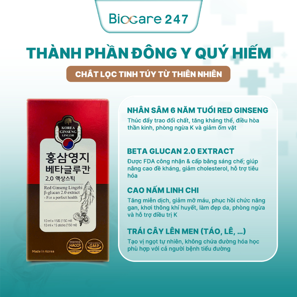 Nhân sâm linh chi Beta Glucan 2.0 Extracr với thành phần Nhân sâm 6 năm tuổi Red Ginseng và nấm linh chi, đây được mệnh danh là thần dược trong Đông y của Hàn Quốc, được người dân Hàn Quốc sử dụng hàng ngày như là 1 loại thực phẩm bổ sung cho sức khỏe. Sản phẩm đặc biệt phù hợp với người cao tuổi, hay mệt mỏi, người mới ốm dậy, suy nhược cơ thể,… Trong những năm trở lại đây, Nhân sâm linh chi Beta Glucan dần trở thành món quà sức khỏe được ưu tiên lựa chọn để tặng cho người thân và đối tác quan trọng.