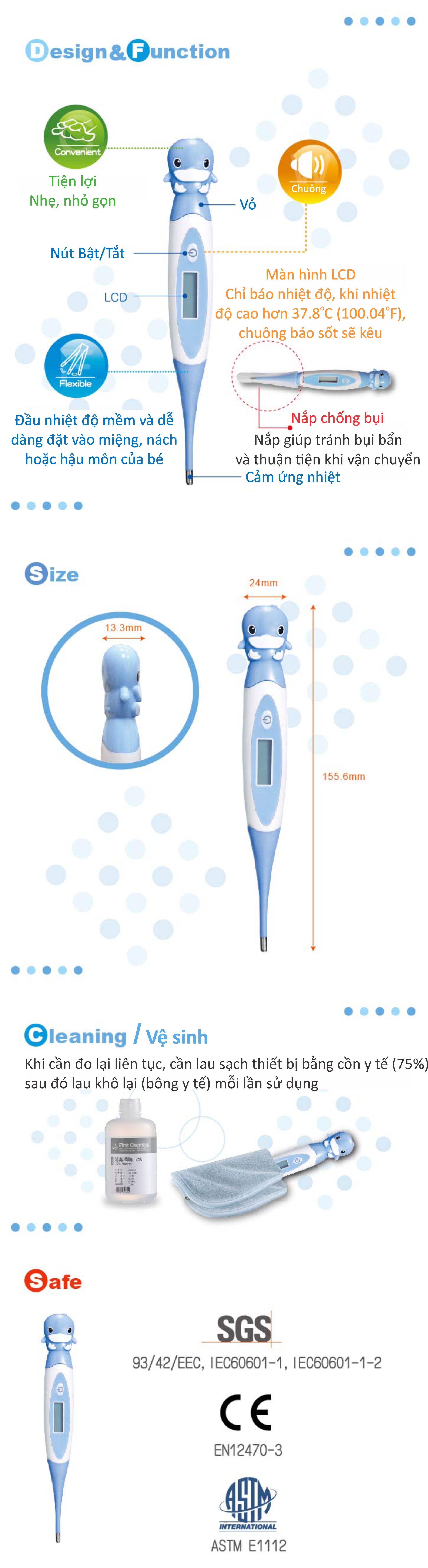 - Nhiệt kế 3in1 thiết kế đơn giản, siêu nhỏ gọn để có thể đo được ở 3 vị trí: miệng, nách, hậu môn. - Đầu nhiệt kế ngắn, tròn và mỏng an toàn tuyệt