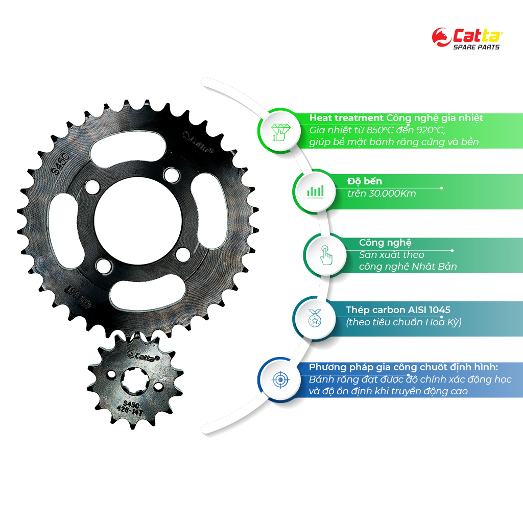Nhông – Dĩa CATTA: Phương pháp gia công chuốt định hình và được nhiệt luyện ở chế độ phù hợp để đảm bảo bề mặt bánh răng cứng và bền, bánh răng đạt được độ chính xác động học và độ ổn định khi truyền động cao.