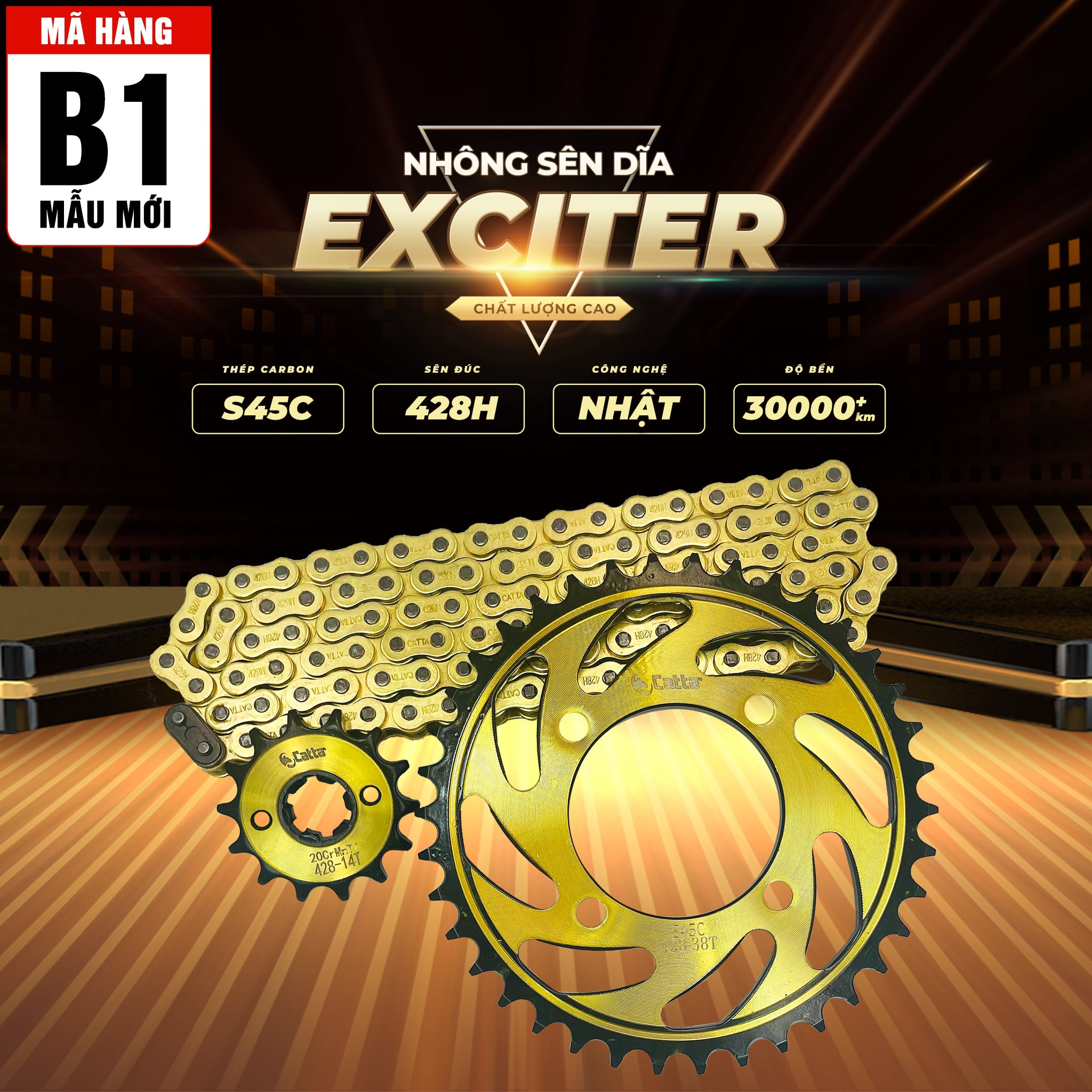 Nhông sên dĩa Exciter (bộ nhông xích Exciter) thương hiệu CATTA Spare Parts được sản xuất từ thép carbon S45C chuyên dụng trong ngành công nghiệp nhông sên dĩa. Do đó, sản phẩm đạt chất lượng cao về độ cứng, độ bền, khả năng chịu tải trọng lớn, đạt tiêu chuẩn quốc tế dành cho các sản phẩm truyền động.
