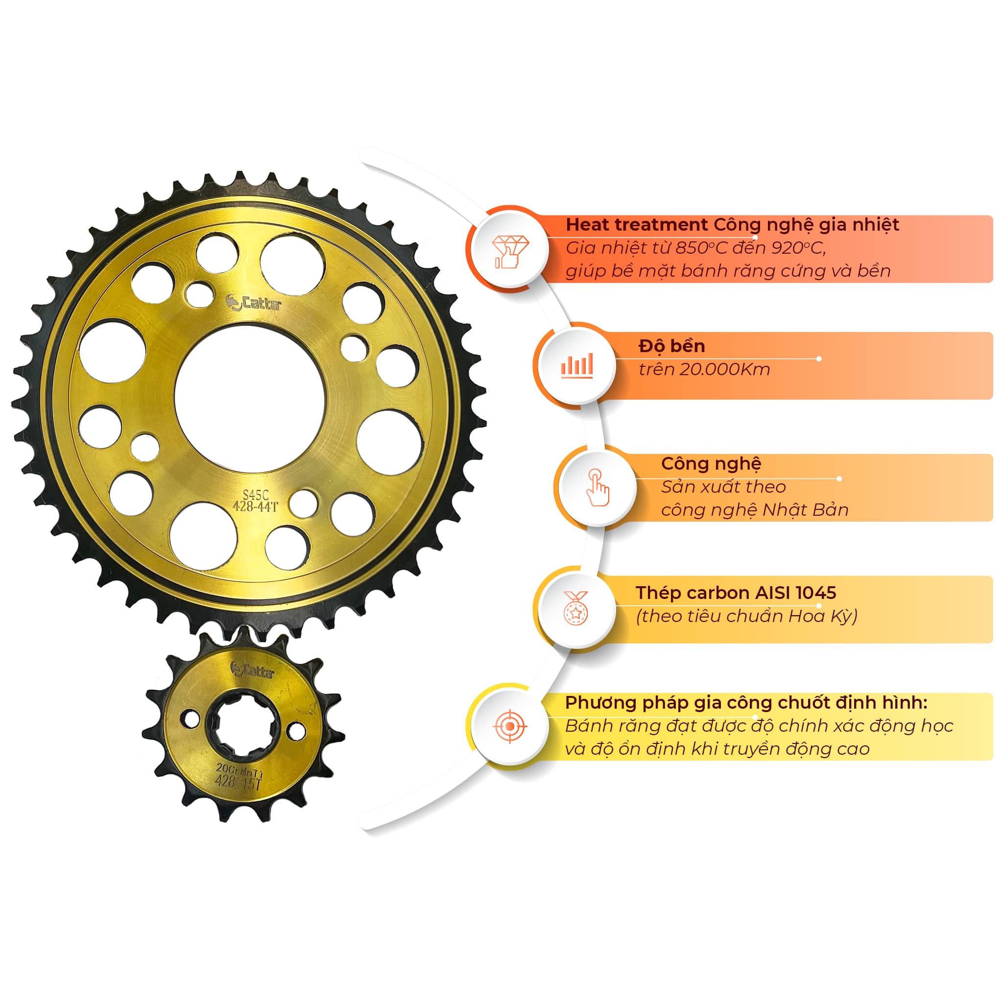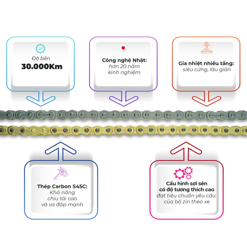 Ngoài ra, dĩa còn được phủ mạ vàng chống gỉ sét nên sản phẩm bền hơn và tuổi thọ cao hơn những sản phẩm tương tự nhưng không được mạ phủ bề mặt. Sên (xích) CATTA được gia nhiệt nhiều tầng giúp sên có độ bền cao, chịu tải tốt, lâu dãn (đa số các sản phẩm sên trên thị trường chưa được gia nhiệt đến tầng cao nhất).