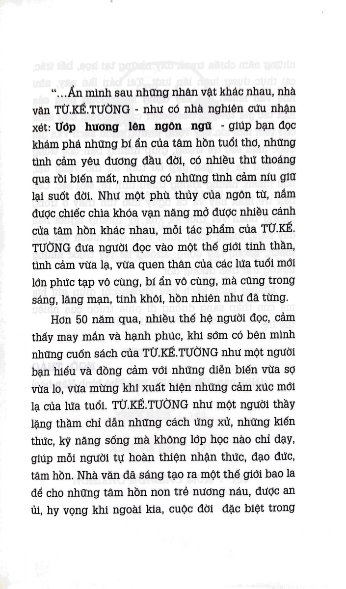 Hơn 50 năm qua, nhiều thế hệ người đọc, cảm thấy may mắn và hạnh phúc, khi có những cuốn sách của Từ Kế Tường làm bạn. Nhà văn đã sáng tạo ra một thế giới bao la để cho những tâm hồn trẻ nương náu, được an ủi, hy vọng khi ngoài kia, cuộc đời - nhất là trong những năm chiến tranh đầy những tai họa, bất trắc, cái thực dụng luôn lấn lướt.