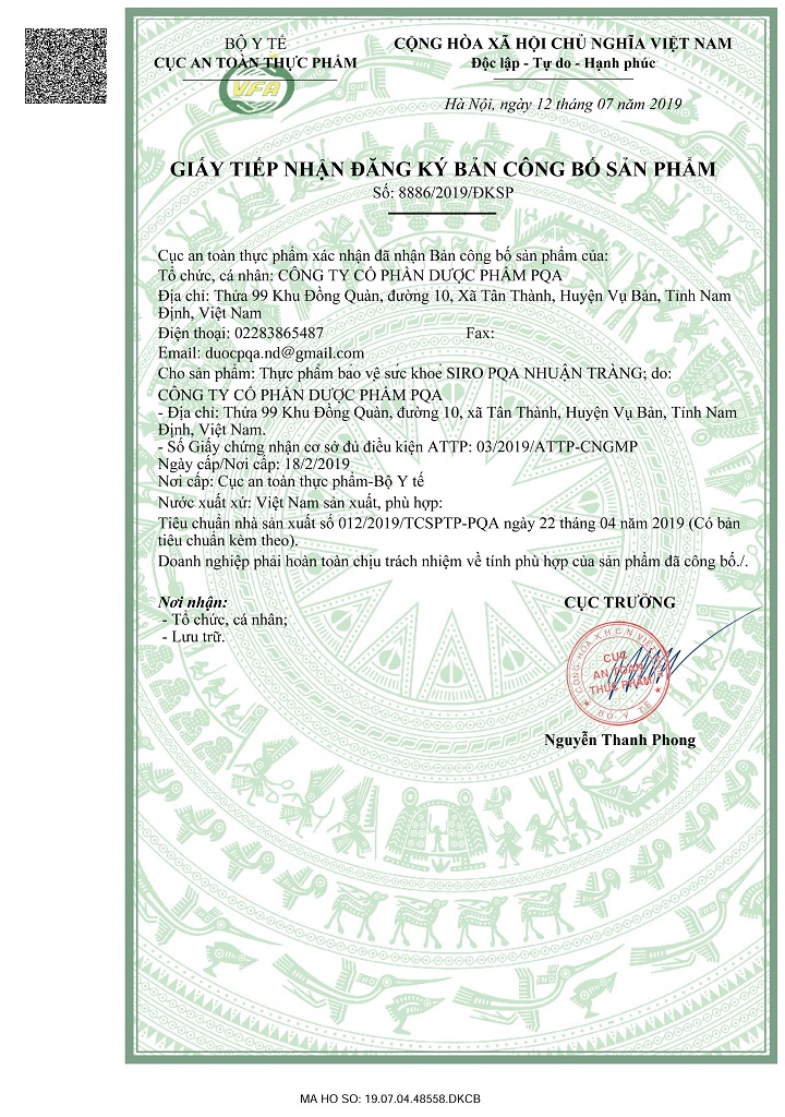 - Địa chỉ sản xuất: Công ty Cổ phần Dược phẩm PQA. Thửa 99, Khu Đồng Quàn, Xã Tân Thành, Huyện Vụ Bản, Tỉnh Nam Định. THÀNH PHẦN: