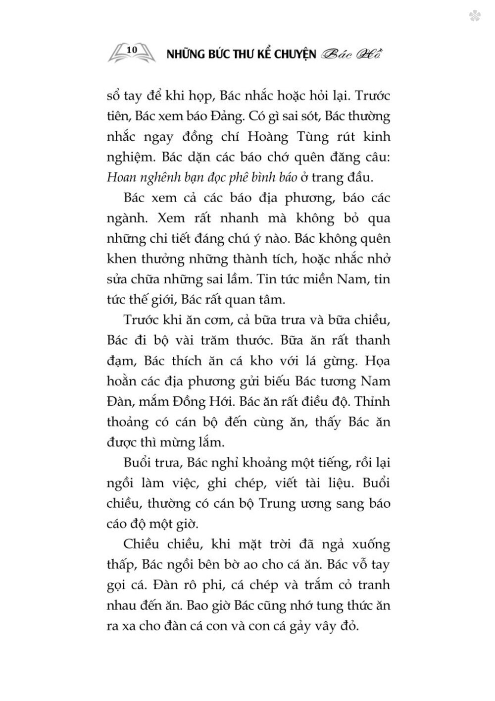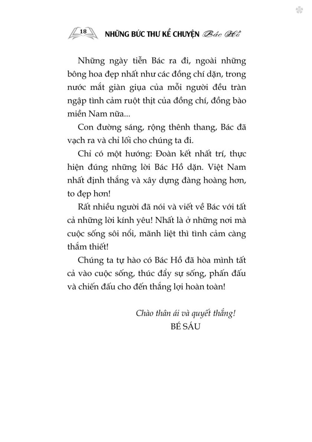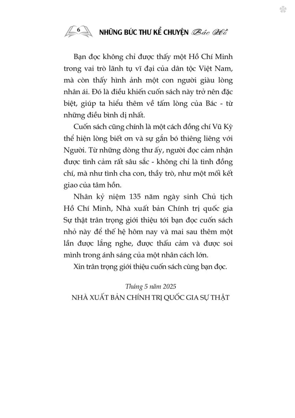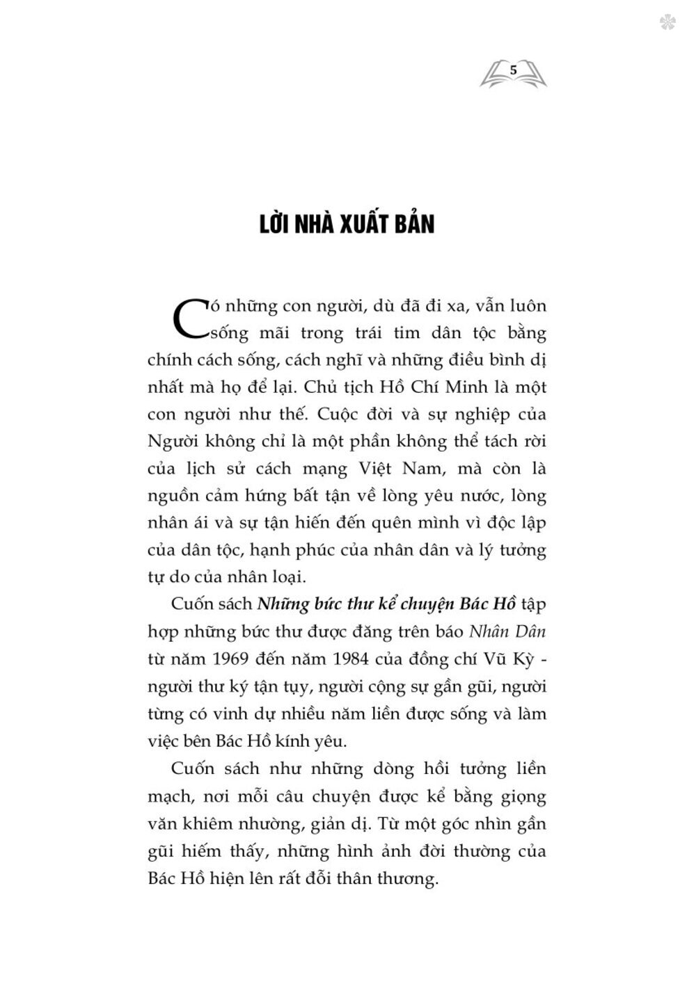 Mua tại TiktokCuốn sách Những bức thư kể chuyện Bác Hồ tập hợp những bức thư được đăng trên báo Nhân Dân từ năm 1969 đến năm 1984 của đồng chí Vũ Kỳ người thư ký tận tụy, người cộng sự gần gũi, người từng có vinh dự nhiều năm liền được sống và làm việc bên Bác Hồ kính yêu. Cuốn sách như những dòng hồi tưởng liền mạch, nơi mỗi câu chuyện được kể bằng giọng văn khiêm nhường, giản dị. Từ một góc nhìn gần gũi hiếm thấy, những hình ảnh đời thường của Bác Hồ hiện lên rất đỗi thân thương.