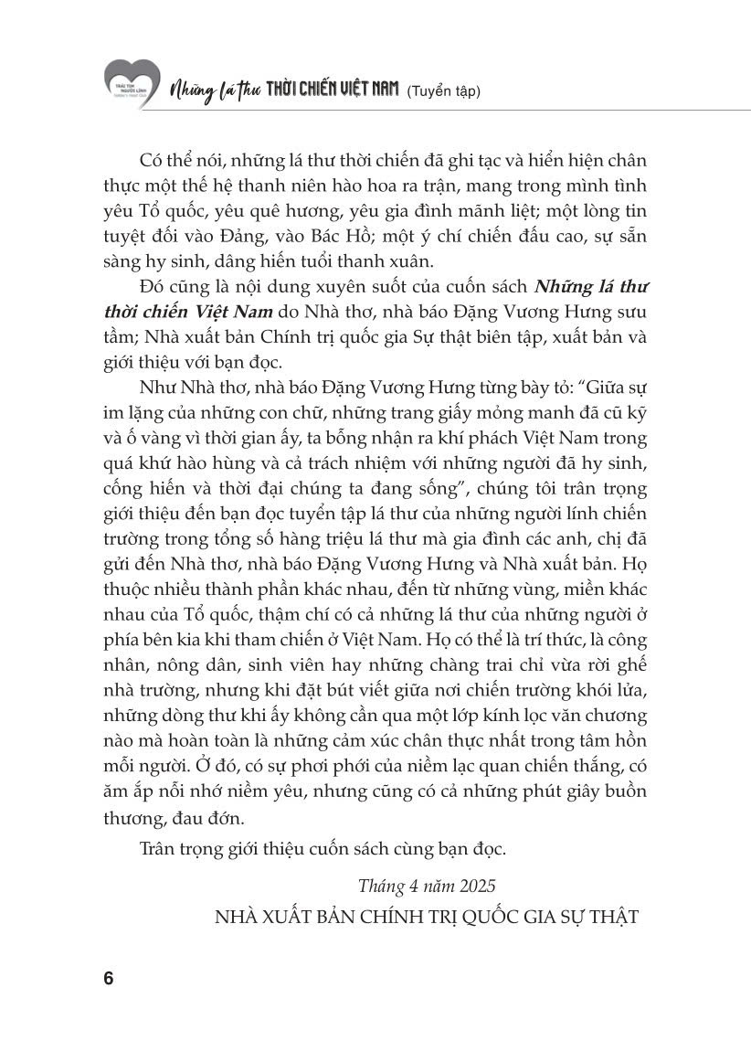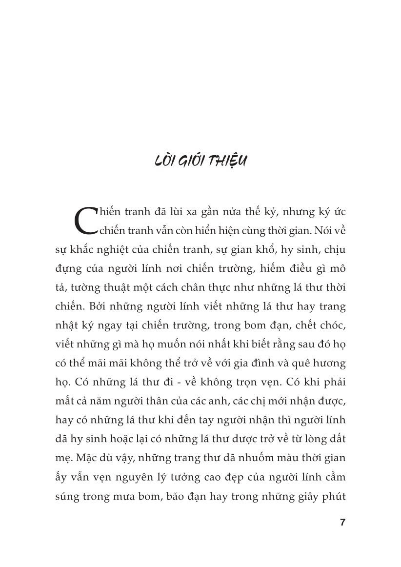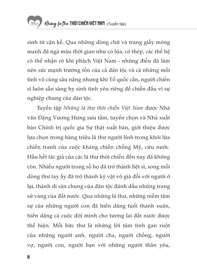 Mua tại TiktokCuốn sách “Những lá thư thời chiến ở Việt Nam” do cựu chiến binh Đại tá, nhà báo, nhà văn Đặng Vương Hưng sưu tầm, biên soạn, giới thiệu 200 lá thư được lựa chọn từ hàng triệu lá thư của người chiến sĩ Bồ đội Cụ Hồ lực lượng tham gia cách mạng... trong kháng chiến chống Mỹ, cứu nước. Hầu hết tác giả của các lá thư đến nay đã không còn nhưng những lá thư tay đã trở thành chứng nhân lịch sử sinh động về lý tưởng sống cao đẹp, sự hy sinh và cống hiến cho độc lập, tự do của dân tộc. Cùng với đó, những lá thư còn thể hiện sâu sắc về tình yêu gia đình, tình yêu lứa đôi hòa quyện với tình yêu quê hương, Tổ quốc.
