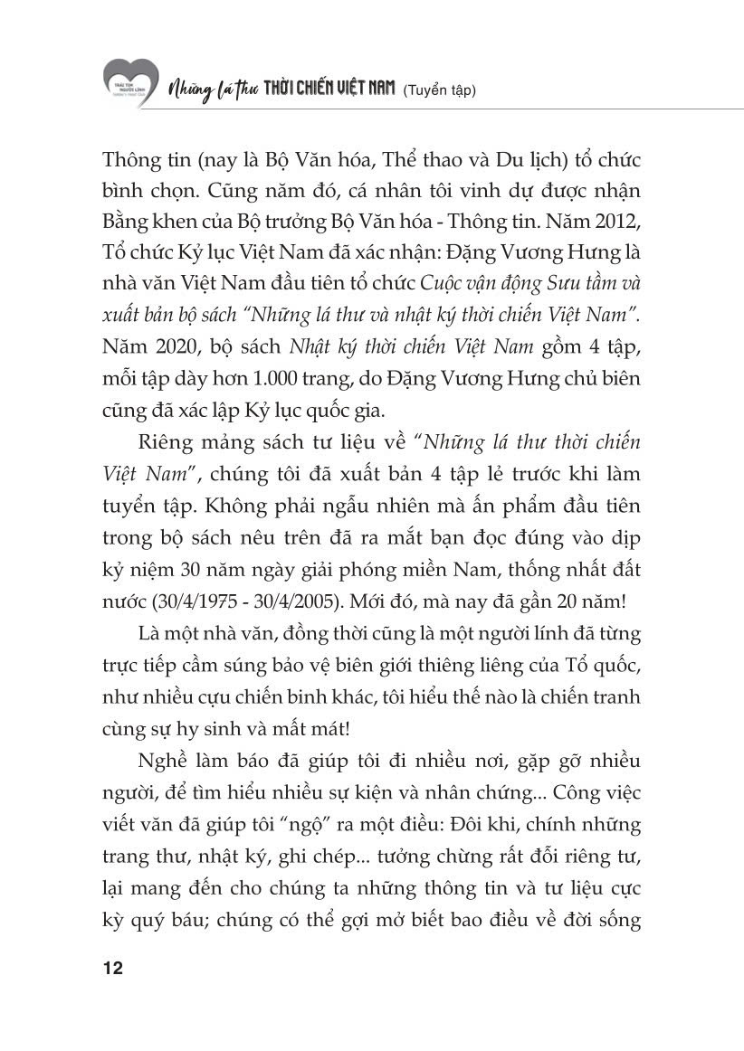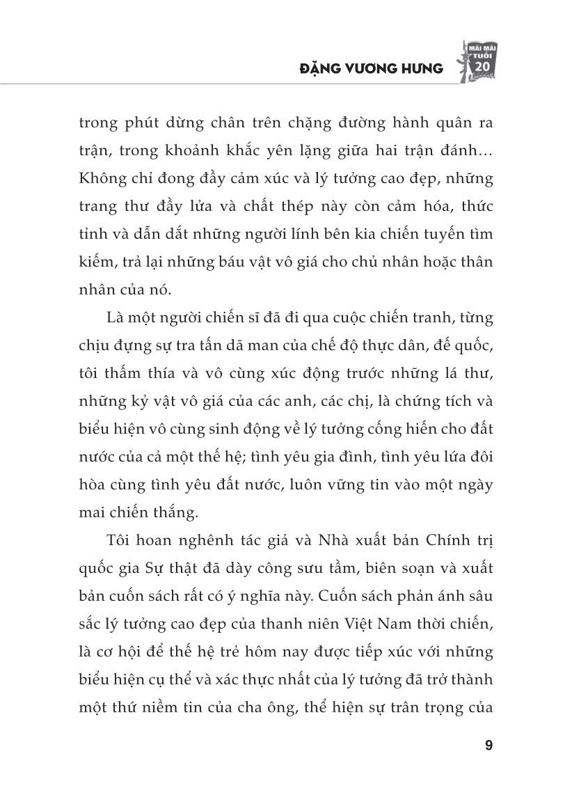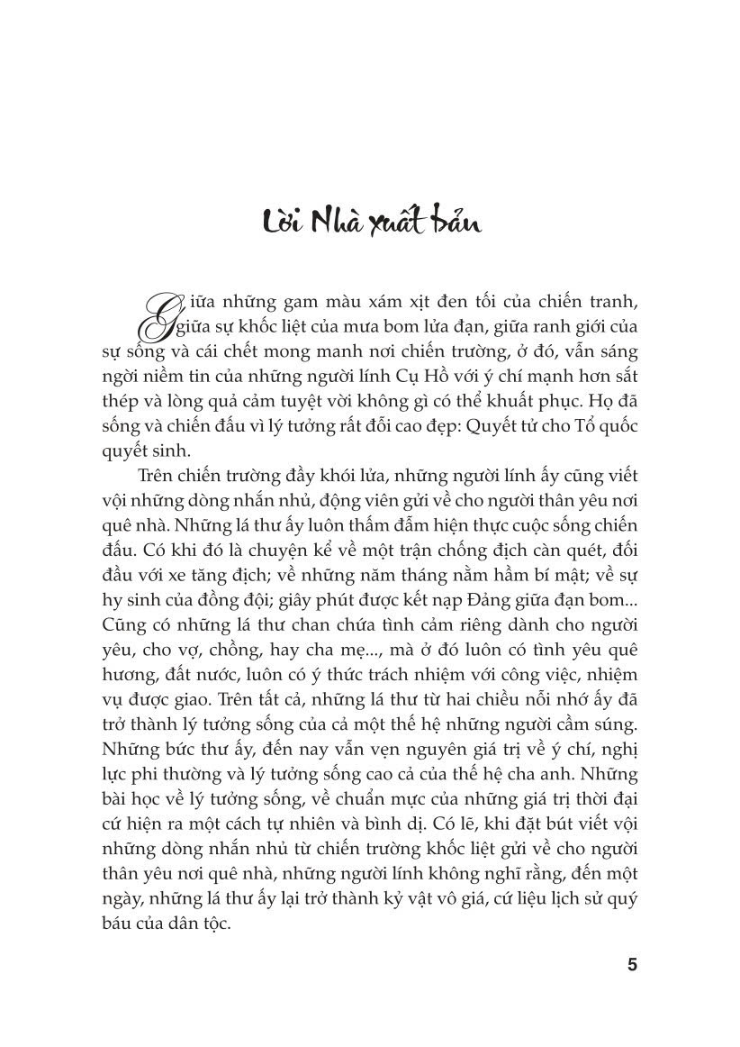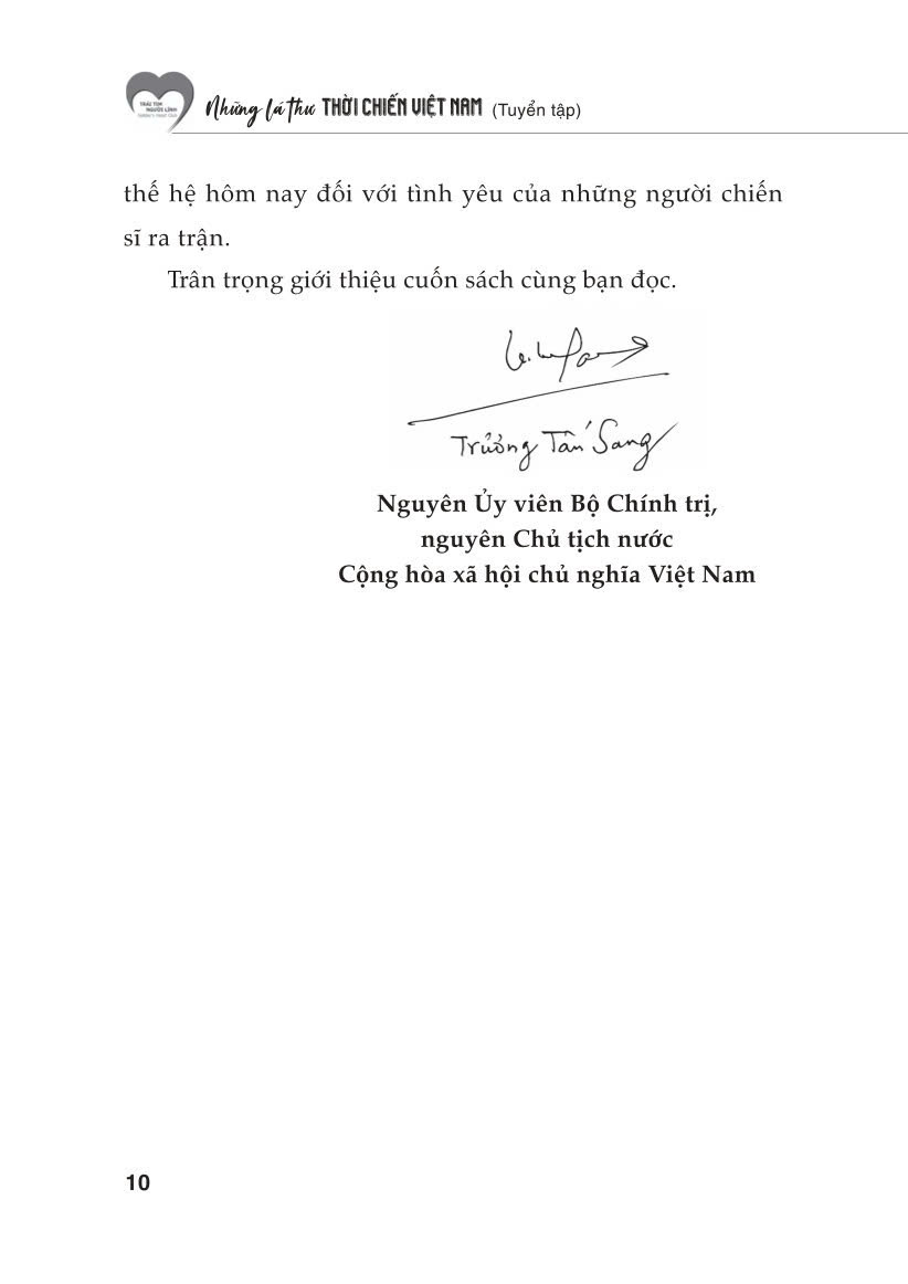 Mua tại TiktokCuốn sách “Những lá thư thời chiến ở Việt Nam” do cựu chiến binh Đại tá, nhà báo, nhà văn Đặng Vương Hưng sưu tầm, biên soạn, giới thiệu 200 lá thư được lựa chọn từ hàng triệu lá thư của người chiến sĩ Bồ đội Cụ Hồ lực lượng tham gia cách mạng... trong kháng chiến chống Mỹ, cứu nước. Hầu hết tác giả của các lá thư đến nay đã không còn nhưng những lá thư tay đã trở thành chứng nhân lịch sử sinh động về lý tưởng sống cao đẹp, sự hy sinh và cống hiến cho độc lập, tự do của dân tộc. Cùng với đó, những lá thư còn thể hiện sâu sắc về tình yêu gia đình, tình yêu lứa đôi hòa quyện với tình yêu quê hương, Tổ quốc.
