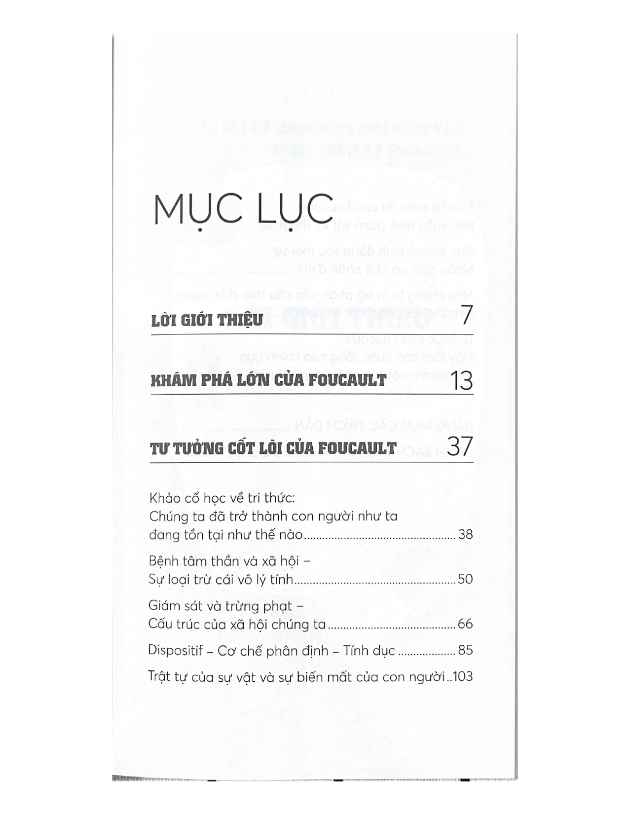 - GIỚI THIỆU SÁCH “Loài người đang tan biến đi như một khuôn mặt vẽ trên cát bên bờ biển.” Michel Foucault nổi tiếng khắp thế giới với tuyên bố rằng con người hiện đại chỉ đại diện cho một bánh răng nhỏ bé trong một cỗ máy toàn trị khổng lồ. Ông lập luận, mỗi người chúng ta đều là một bộ phận của một cơ chế năng động toàn trị của việc nhìn và bị nhìn, buộc ta phải hướng tới tính bình thường, hay thực tế phải hướng tới sự thích nghi và tuân phục hoàn toàn. Do đó, ông kết luận rằng gần như, chúng ta đang có nguy cơ bị hòa tan hoàn toàn trong những cấu trúc này. “Triết học cho mọi người! Bộ sách Những nhà tư tưởng lớn lần đầu tiên trình bày sâu sắc công trình của các nhà triết học quan trọng nhất: Dễ hiểu, thú vị và rất thời sự.” – Martin Politowski “Lý tính như là sự khuất phục trước sức ép buộc phải bình thường; Con người như là “kẻ cai trị làm tù nhân cho chính mình” chắc chắn sẽ chết dần chết mòn như là chủ thể – đây là một tác phẩm đầy khiêu khích, tranh cãi và rất đáng đọc.” – GS. Roland Hormel
