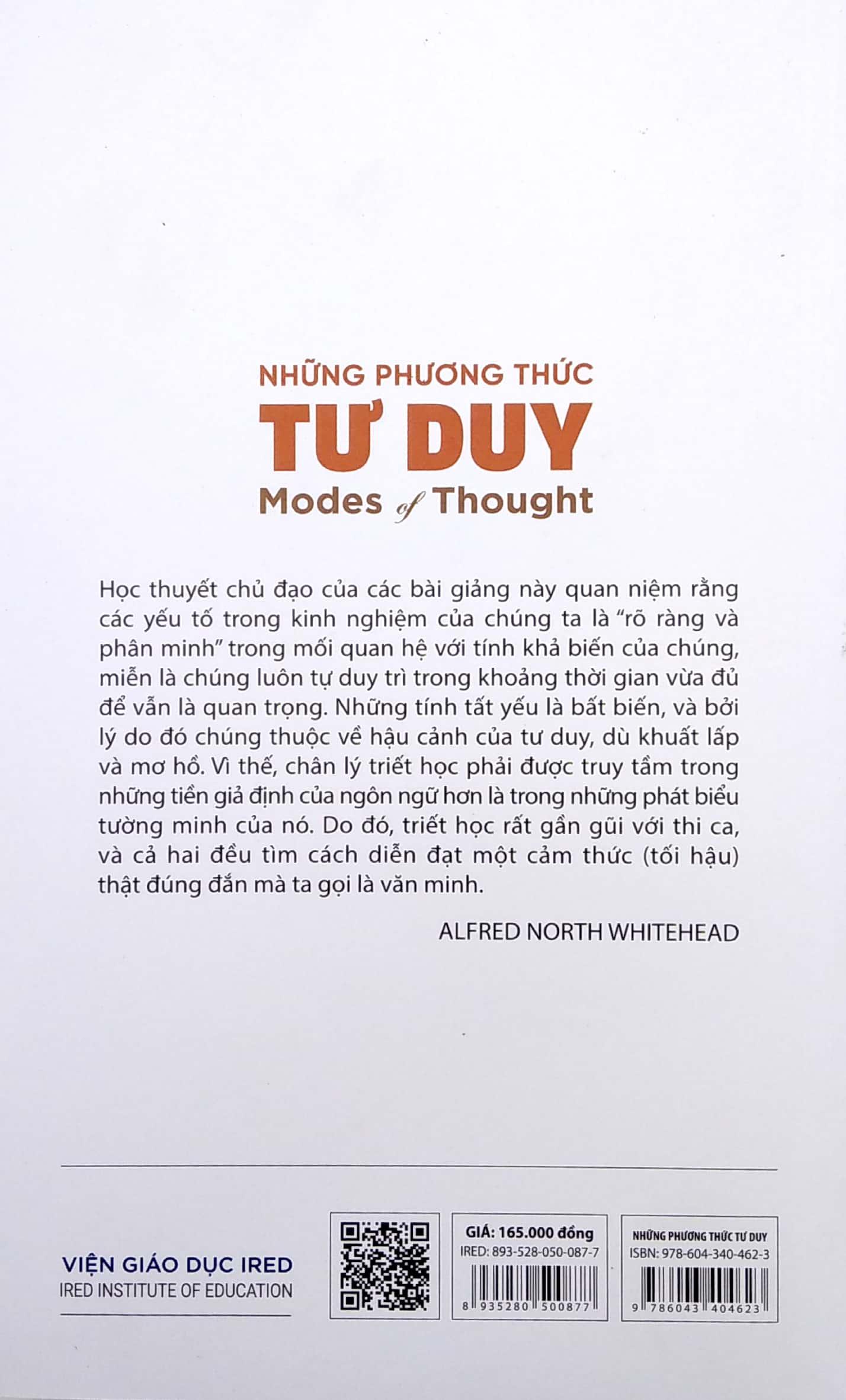 Những phương thức tư duy là một cuốn sách cô đọng, có mức độ dồn nén và đôi khi bạn đọc gặp phải những lời giảng đầy tính cách ngôn, cực kì hàm súc. Ngay cả khi bạn chưa bao giờ đọc Whitehead, tập sách mỏng này chắc chắn sẽ gợi lên trong bạn rất nhiều suy tư.