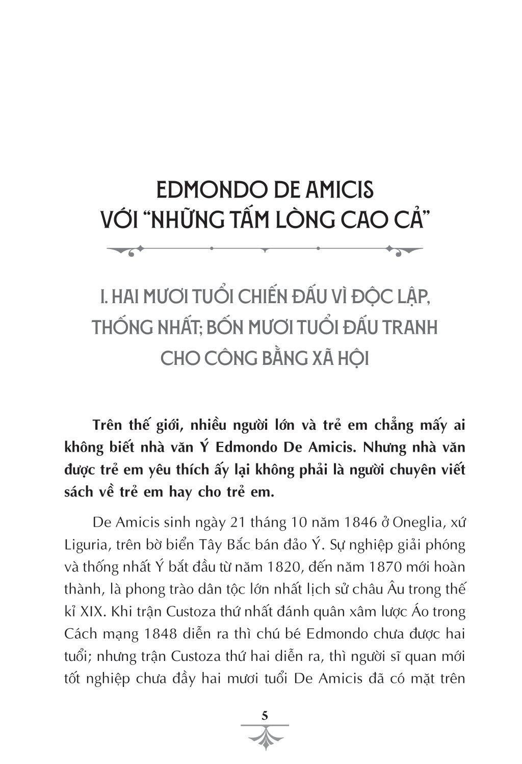 Tác giả: Nhà văn Admondo De Amicis (1846 - 1908) là nhà văn, nhà hoạt động chính trị - xã hội nổi tiếng của nước Ý. Ông cầm bút hơn 40 năm, để lại khá nhiều tác phẩm. Những tấm lòng cao cả (Cuore) ra đời từ những năm 80 của thế kỉ 19 đã làm E. D. Amicis nổi tiếng khắp thế giới.