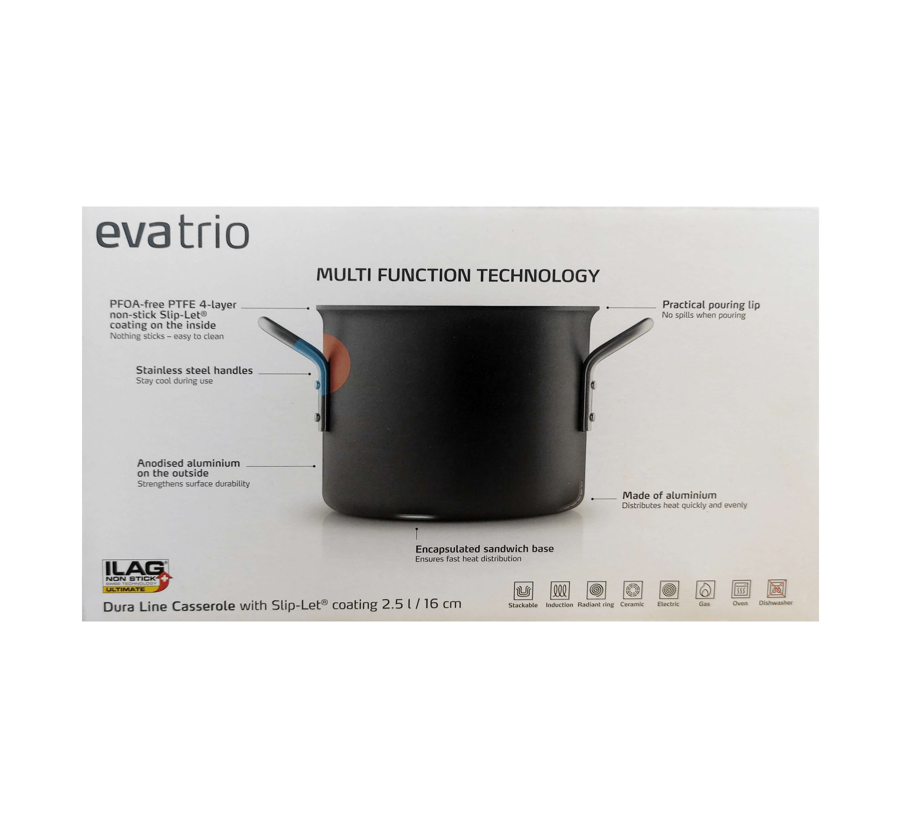 Nồi chống dính 4.8L, 20cm Eva Solo, dòng Dura Line. Nồi và chảo dòng Dura Line được làm bằng nhôm cứng giúp phân phối nhiệt đều, dẫn nhiệt vượt trội. Lớp phủ chống dính Slip-Let