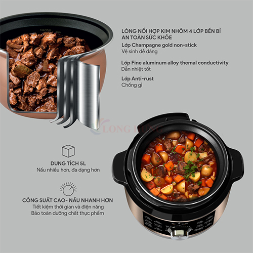 Đặc điểm nổi bật - Nồi áp suất đa chức năng : nấu cơm, nấu cháo, hầm gân, ninh, súp, hấp, giữ ấm - Dung tích : 5.0 lít phù hợp gia đình 4 - 6 người.