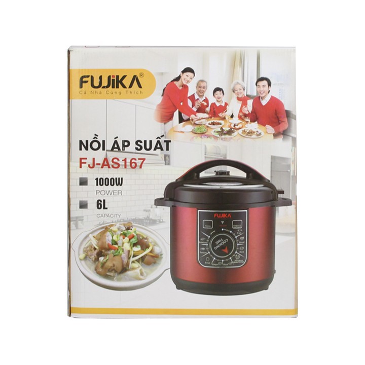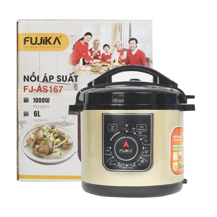 Mua tại TiktokNồi áp suất điện FUJIKA ( Công nghệ nhật bản ) Thông số kỹ thuật: Tên sản phẩm: Nồi áp suất điện 6L FUJIKA Thương hiệu : FUJIKA Model: FJ-AS167 (6L) Chức năng: nấu cơm, nấu cháo đặc, cháo loãng, món súp, nấu thịt/hầm xương, tiềm gà/vịt, hầm thịt bò/thịt cừu, hầm đậu, nấu cá, hầm các món ăn cho trẻ đa năng Chất liệu lòng nồi : Hợp kim nhôm cao cấp Chất liệu vỏ : Thép không gỉ sơn tĩnh điện Bảng điều khiển : Nút xoay dễ dàng sử dụng Model: FJ-AS167 (6L) Màu sắc: Đỏ Nâu/Vàng Ánh Kim (Giao Màu Ngẫu Nhiên) Công suất: 1000W Điện áp: 220V-50Hz Tần số: 50Hz Có 9 chế độ nấu tùy chỉnh tiện lợi Với Công suất 1000W Áp suất lớn giúp nhiệt độ sôi của nước cao, nhờ vậy rút ngắn thời gian nấu và giảm hao tốn điện năng. Nhiều chức năng nấu