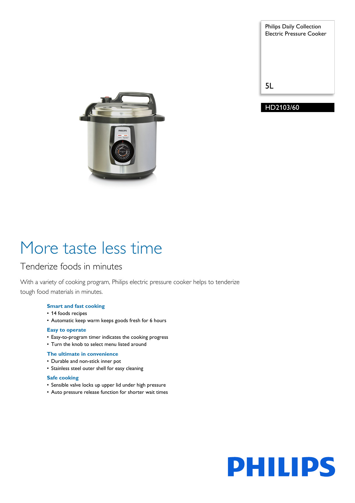 Nồi áp suất điện đa năng Philips HD2103 Chi tiết: Nhiều chức năng: nấu cơm, hầm thịt, hầm xương, đun nước... Nồi chống dính cao cấp dày 1,8mm, bền, dễ chùi rửa. Thiết bị an toàn