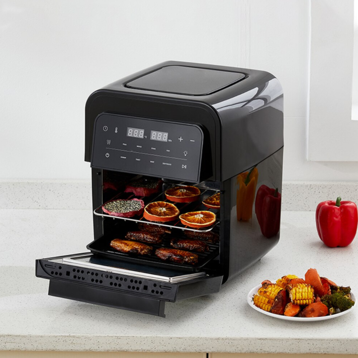 Nồi chiên không dầu dung tích 12 lít công suất 1500W • Phù hợp với nhiều thực đơn & nhu cầu nấu nướng lớn • Tích hợp quạt đối lưu và chức năng quay: Giúp