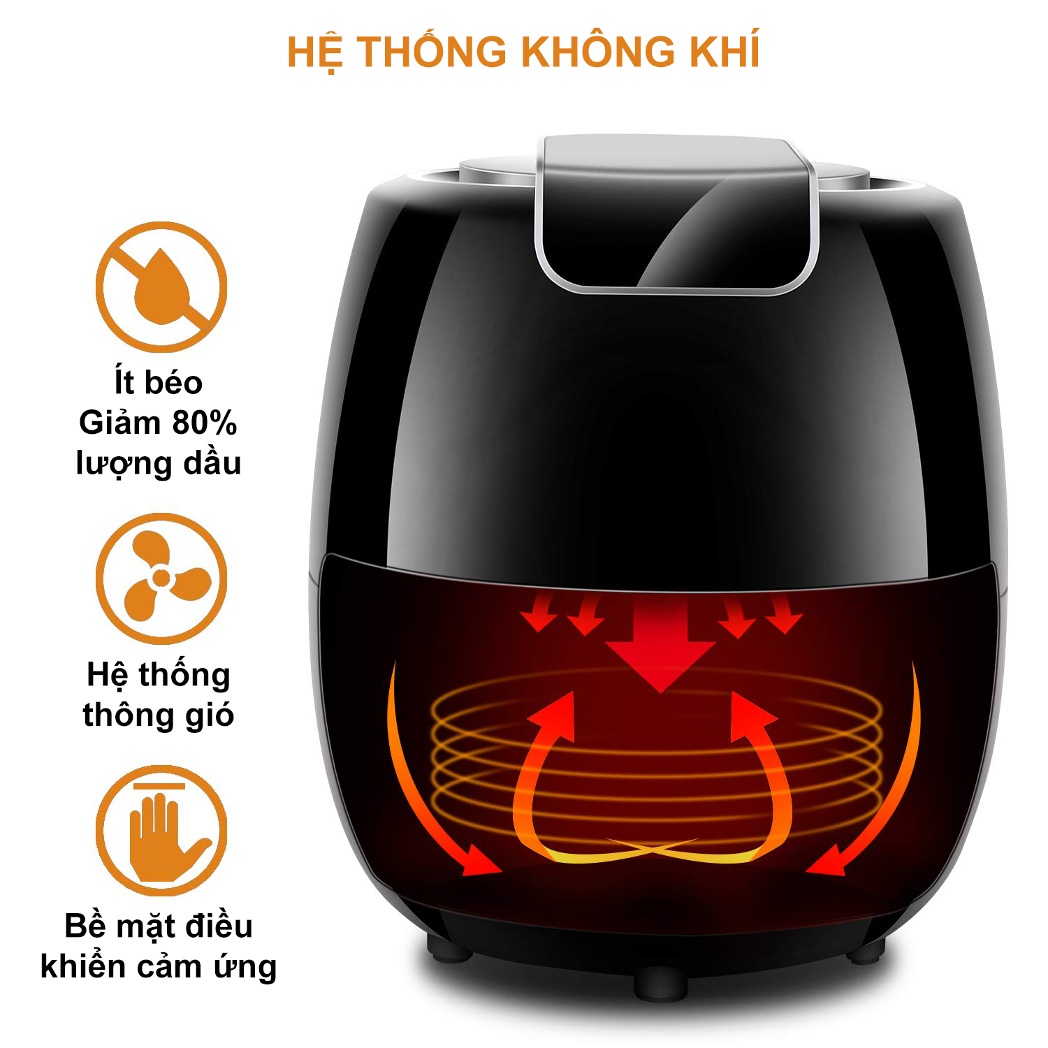 Hệ thống thông gió của nồi giúp nhiệt đối lưu luân chuyển bên trong lòng nồi khi nồi làm việc, thức ăn sẽ được chín đều, và nhiệt độ nóng sẽ đi ra ngoài theo một khe thông gió giúp nồi hoạt động ổn định, không gây hiện tượng quá nóng, tăng cường tuổi thọ cho nồi chiên.