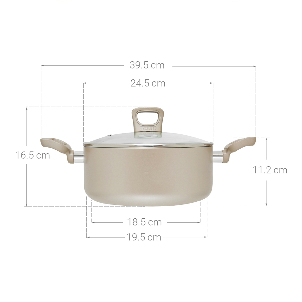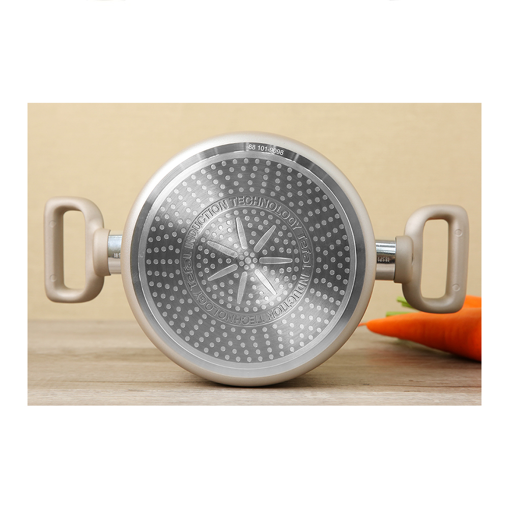 Nồi, chảo Tefal Sensations thiết kế từ Pháp được làm bằng hợp kim nhôm cao cấp với màu đồng trang nhã bên trong phủ lớp chống dính Titanium Reinforced, thích hợp cho nhiều kiểu nấu nướng, sử dụng được trên bếp từ.