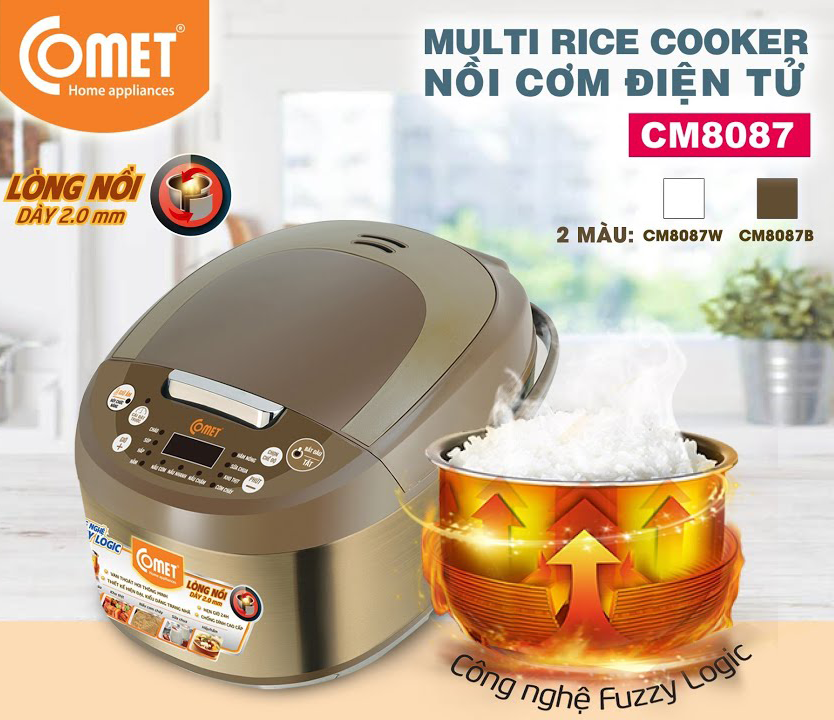 - Sản xuất tại: Trung Quốc. MÔ TẢ: -Nồi cơm điện Comet CM8087 thiết kế sang trọng và hiện đại mang đến cho gia đình bạn những bữa cơm đầm ấm. -Nồi cơm điện Comet này được tích hợp nhiều chức năng tiện ích. Không những sản phẩm nấu cơm chín ngon mà nó còn có thể nấu cháo, kho thịt, nấu cơm cháy, làm sữa chua, hấp/hầm. -Nồi cơm điện Comet CM8087 này rất phù hợp đối với những gia đình có đông thành viên. Việc nồi cơm sở hữu công suất 860W giúp nấu cơm nhanh chóng. -Nồi cơm điện này sử dụng công nghệ Fuzzy Logic đây là công nghệ dùng bộ vi xử lý thế hệ mới nhất để tự động điều chỉnh nhiệt độ nấu phù hợp với lượng gạo/loại gạo và nước trong nồi, giúp cơm nấu chín kỹ và ngon hơn kể cả khi bạn cho nhiều hay ít nước (sai số trong khoảng cho phép + 20% - 30%). -Giao hàng màu ngẫu nhiên.