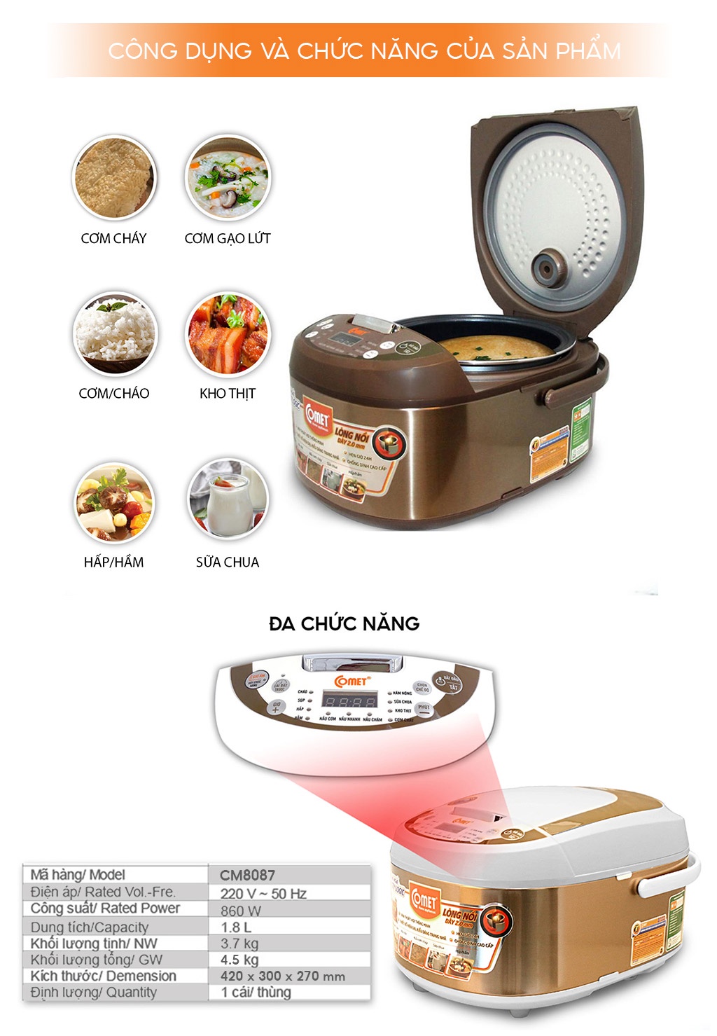 Mua tại TiktokTHÔNG TIN KỸ THUẬT: 1. Thương hiệu: Comet. 2. Sản phẩm: Nồi cơm điện tử. 3. Mã sản phẩm: CM8087. 4. Điện áp: 220V - 50Hz. 5. Công suất: 860W. 6. Dung tích: 1,8l. 7.