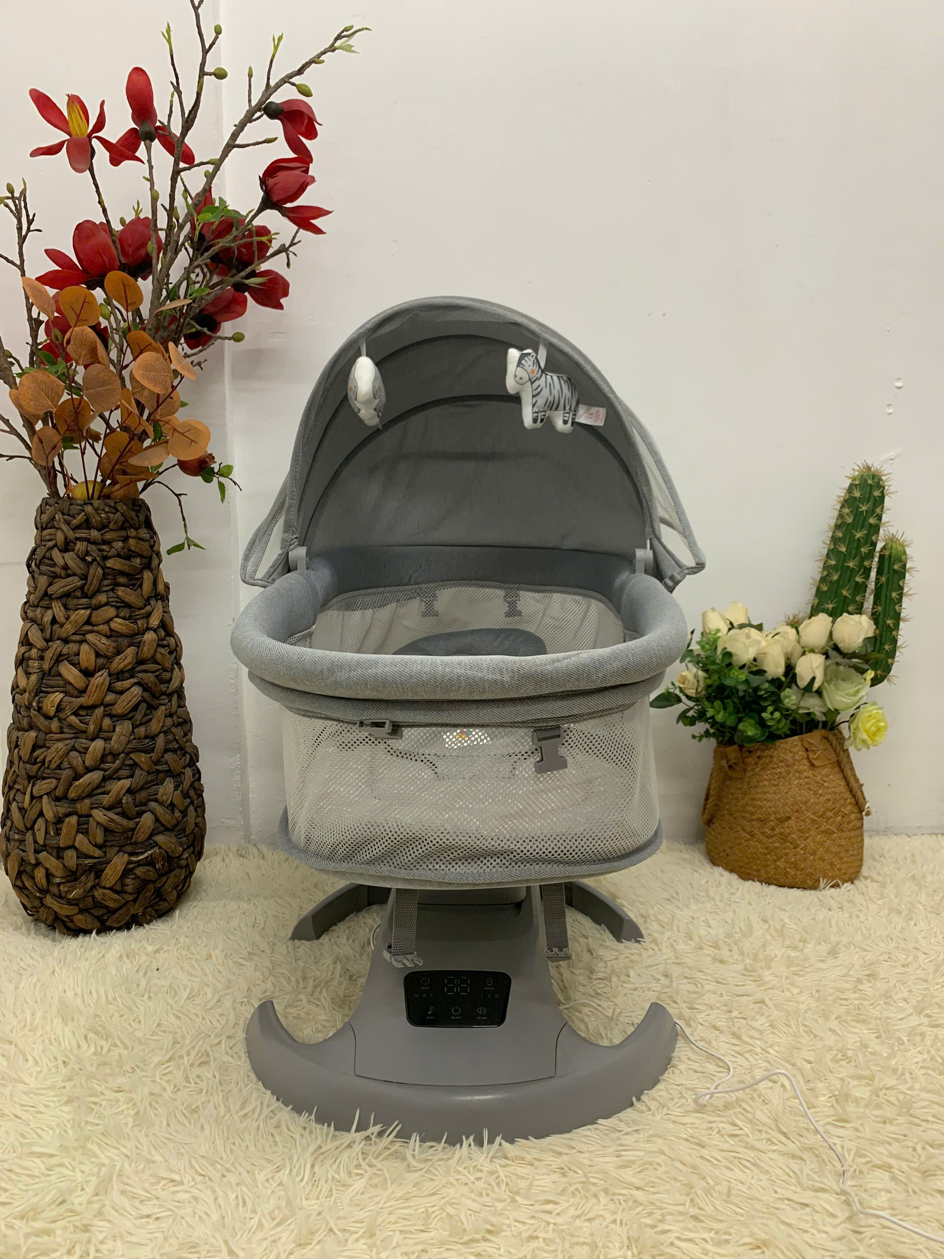 Mua tại TiktokGhế Nôi Điện Tự Động Ru Ngủ Cho Bé Mastela 0911 Giới thiệu sản phẩm Ghế nôi điện tự động ru ngủ cho bé là giải pháp tuyệt vời giúp cha mẹ chăm sóc con yêu dễ dàng và an toàn hơn. Với thiết kế thông minh, sản phẩm vừa mang đến sự thoải mái cho bé, vừa giúp bố mẹ tiết kiệm thời gian, công sức. Chỉ cần đặt bé vào nôi, bật chế độ đung đưa nhẹ nhàng kết hợp âm nhạc ru êm ái, bé sẽ nhanh chóng chìm vào giấc ngủ sâu và ngon hơn. Tính năng nổi bật Đung đưa tự động: Chuyển động êm ái mô phỏng vòng tay mẹ, giúp bé ngủ ngon hơn. Âm nhạc ru du dương: Tích hợp giai điệu nhẹ nhàng, tạo cảm giác thư giãn cho trẻ. Điều khiển từ xa tiện lợi: Bố mẹ dễ dàng điều chỉnh tốc độ đung đưa, âm lượng mà không cần đến gần. Màn che muỗi thông minh: Bảo vệ bé khỏi côn trùng, giữ giấc ngủ an toàn và yên tĩnh. Đệm êm ái, thoáng khí: Chất liệu an toàn, thân thiện với làn da nhạy cảm của bé. Thiết kế gọn nhẹ: Có thể gấp gọn, dễ di chuyển, thích hợp dùng trong gia đình hoặc mang đi du lịch. Độ bền cao: Kết cấu chắc chắn, chịu lực tốt, đảm bảo an toàn cho bé khi sử dụng. Lợi ích khi sử dụng Giúp bé ngủ nhanh và sâu hơn, hạn chế quấy khóc ban đêm. Giải phóng thời gian cho bố mẹ để làm việc nhà hoặc nghỉ ngơi. Tạo môi trường ngủ an toàn, bảo vệ sức khỏe của trẻ. Hỗ trợ phát triển thể chất và tinh thần nhờ giấc ngủ chất lượng. Hướng dẫn sử dụng Đặt nôi ở nơi bằng phẳng, thoáng mát. Cắm điện hoặc lắp pin (tùy phiên bản). Đặt bé vào nôi, cài dây an toàn. Sử dụng bảng điều khiển hoặc remote để chọn chế độ đung đưa, nhạc và thời gian. Luôn giám sát bé khi nôi hoạt động. Hướng dẫn bảo quản Lau sạch nôi bằng khăn mềm, không dùng chất tẩy mạnh. Đệm và vải che có thể tháo rời để giặt. Bảo quản nơi khô ráo, tránh ẩm mốc. Kiểm tra định kỳ khớp nối, dây an toàn trước khi sử dụng. Thông tin sản phẩm Loại sản phẩm: Ghế nôi điện tự động cho bé. Độ tuổi sử dụng: Trẻ sơ sinh đến khoảng 18 tháng tuổi (tùy cân nặng). Chất liệu: Khung kim loại + vải cao cấp thoáng khí. Tính năng: Đung đưa tự động, nhạc ru, điều khiển từ xa, màn che muỗi. Màu sắc: Xám hiện đại, dễ phối nội thất. Bảo hành: Theo chính sách nhà cung cấp. Hướng dẫn bảo quản sản phẩm