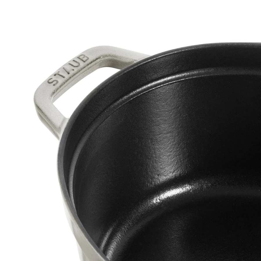 - Nồi Tròn Staub 16cm – Màu Xám - Thiết kế sang trọng, có thể đặt ngay trên bàn ăn sau khi nấu. - Lớp phủ màu bên ngoài chống trầy và bền màu theo thời