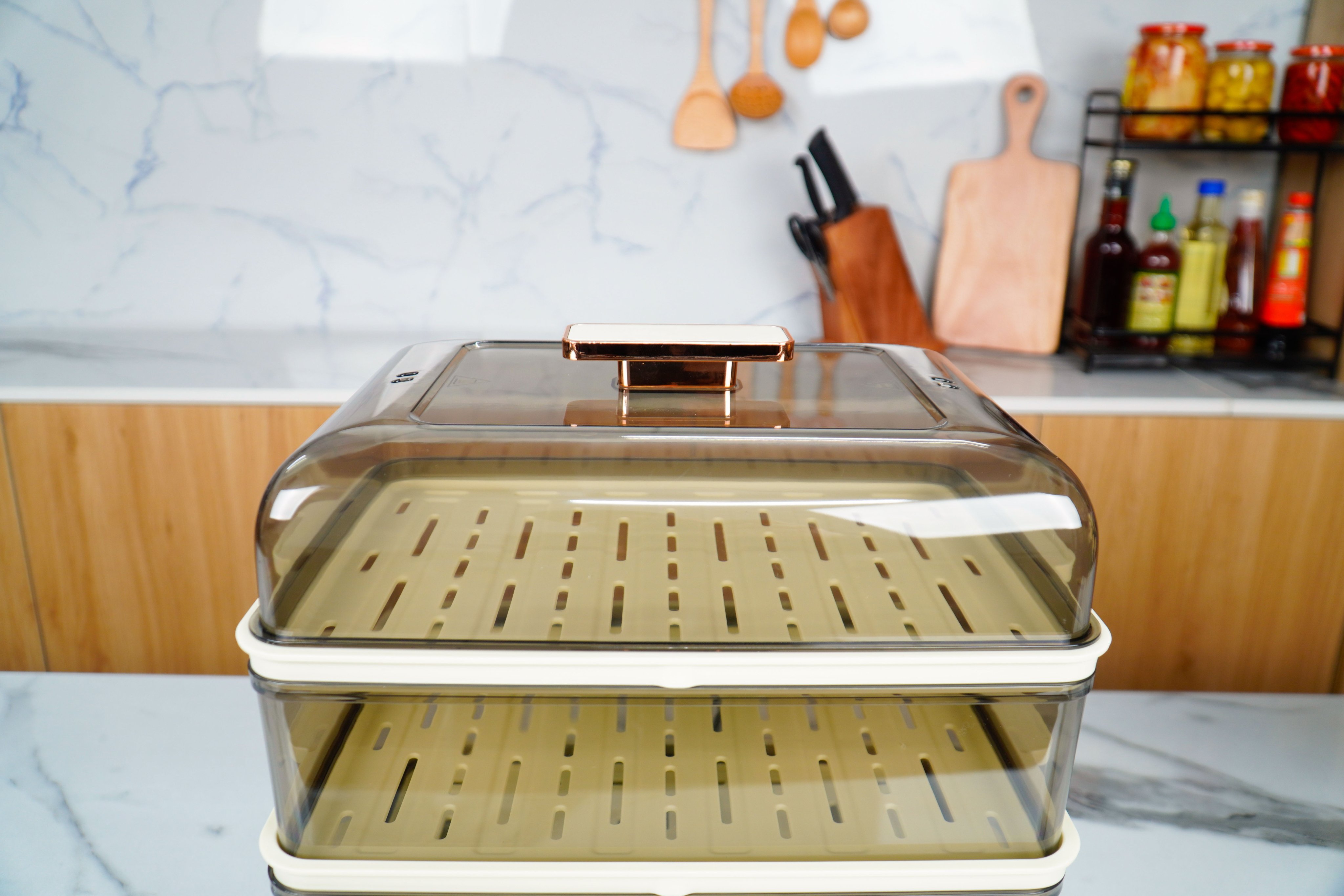 - Thiết kế đa tầng: Nồi hấp Bear EFS-4H27E thường có nhiều tầng hấp (phổ biến là 2 hoặc 3 tầng), cho phép bạn hấp cùng lúc nhiều loại thực phẩm khác nhau (ví dụ: