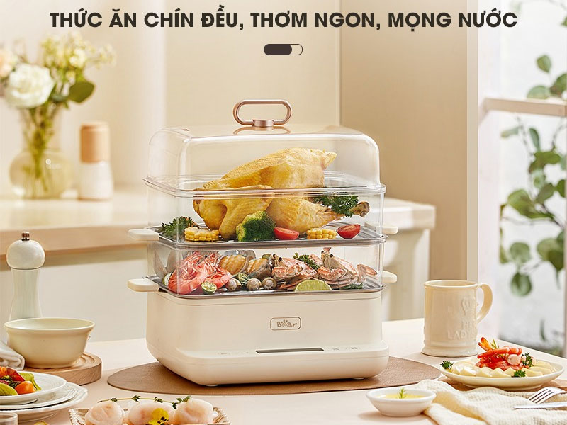 Mua tại TiktokĐủ phục vụ cả nhà Nồi hấp điện đa năng Bear SB-NH12L có dung tích 12 lít bao gồm 3 tầng rộng rãi hấp các loại thực phẩm đủ mọi kích cỡ. Khay hấp inox cao cấp Khay hấp của SB-NH12L được làm từ inox siêu bền, kháng khuẩn tới 99%, đảm bảo sức khỏe người dùng và dễ dàng vệ sinh sau khi sử dụng. Đa dạng chế độ hấp Khi sở hữu nồi hấp điện đa năng Bear SB-NH12L, bạn sẽ được trải nghiệm 6 chế độ hấp dành cho đa dạng loại thực phẩm như hấp hải sản, sườn heo, thực phẩm cứng/mềm, bánh bao, xôi,... Đặc biệt, sau khi hoàn thành chu trình hấp, nồi sẽ tự động chuyển sang chế độ giữ ấm, đảm bảo thức ăn luôn được ấm nóng, thơm ngon. Làm chín đều thức ăn nhanh chóng Công suất 800W cùng thiết kế vòng tập trung năng lượng, nồi hấp nhanh chóng đun sôi và giải phóng hơi nước giúp thực phẩm chín nhanh, chín đều. Hẹn giờ tiện lợi Với chức năng này, bạn có thể cho thực phẩm vào nồi hấp và cài đặt thời gian thích hợp, sau đó nồi hấp sẽ làm nhiệm vụ của mình và bạn sẽ có ngay món ăn thơm ngon đúng lúc bạn mong muốn. Lưu ý khi sử dụng