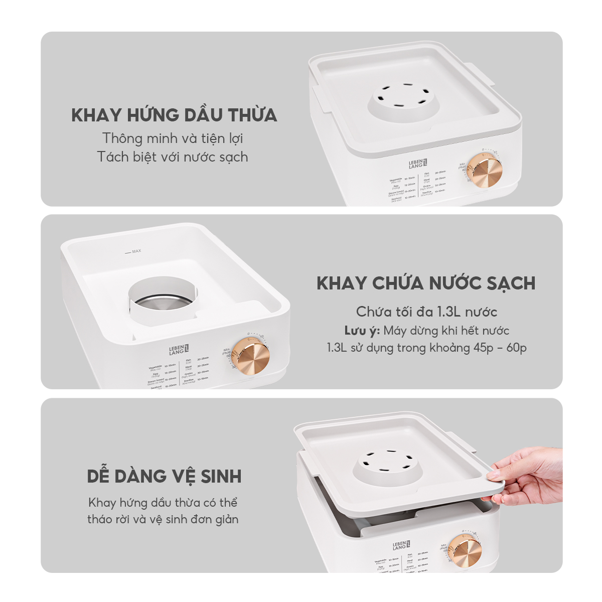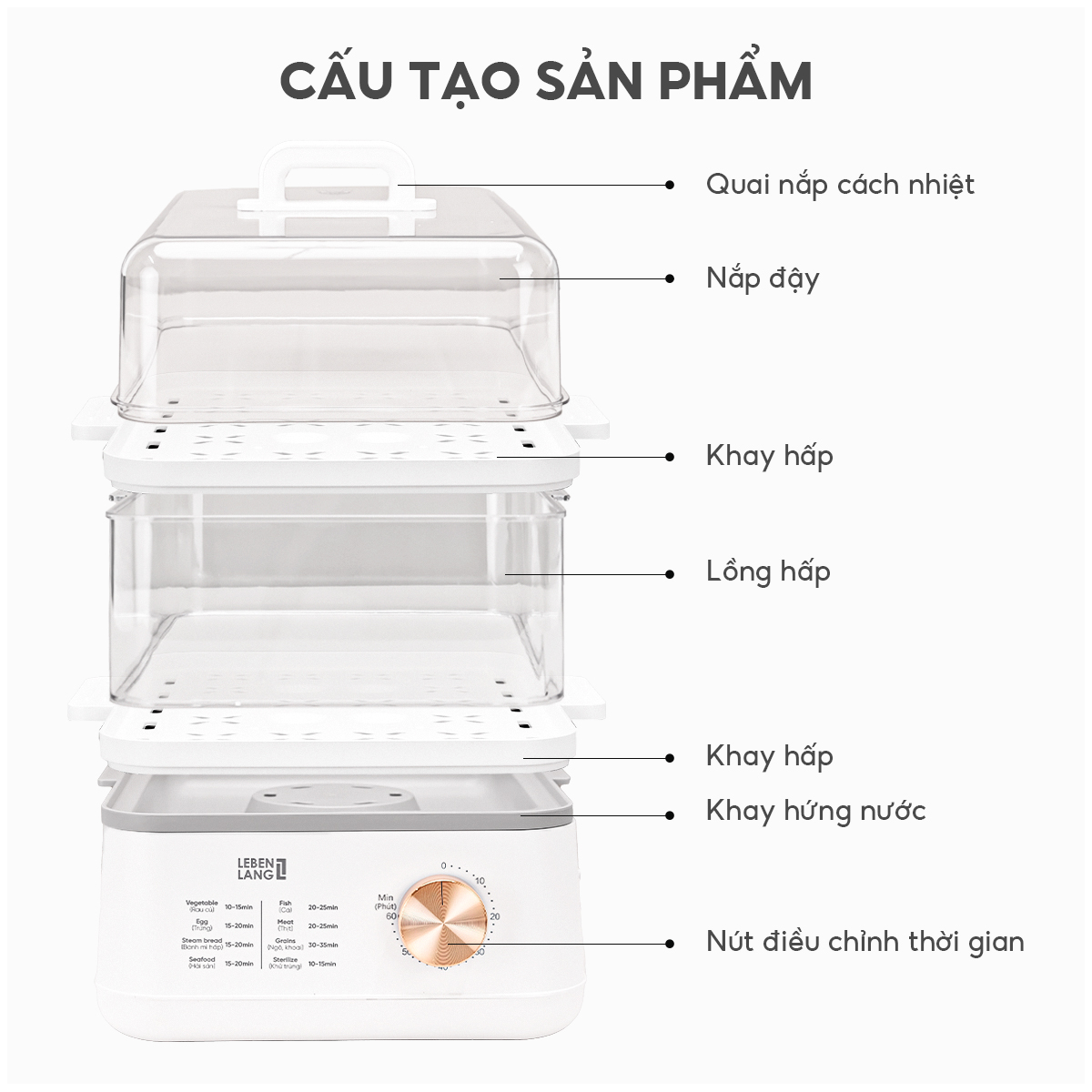 - Đa Chức Năng: Nồi hấp Lebenlang không chỉ hấp đơn thuần mà còn có chức năng hâm nóng, hẹn giờ, phù hợp với nhiều nhu cầu sử dụng khác nhau trong gia đình.