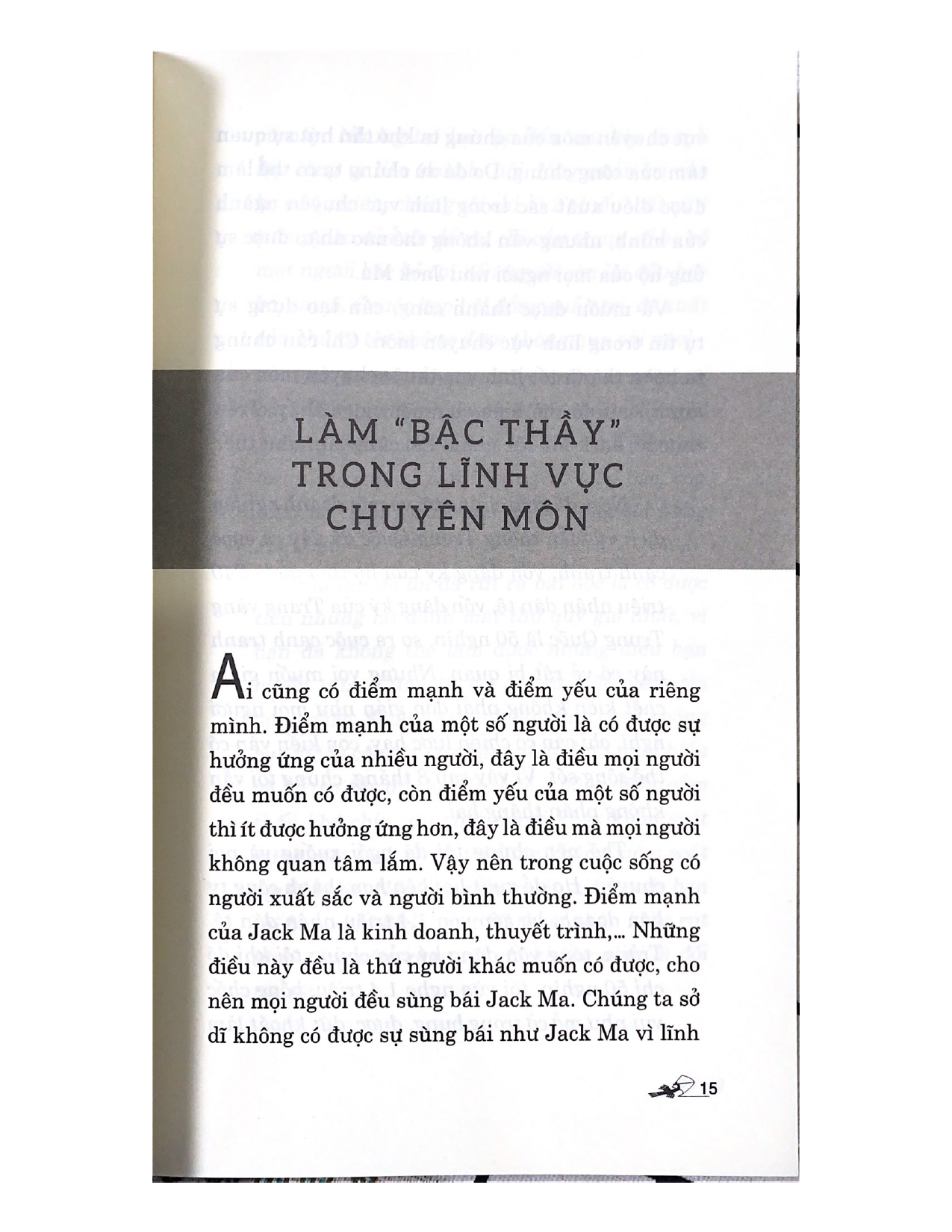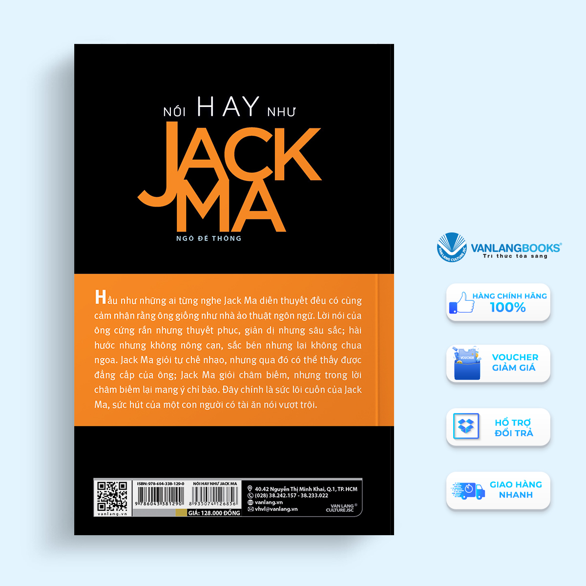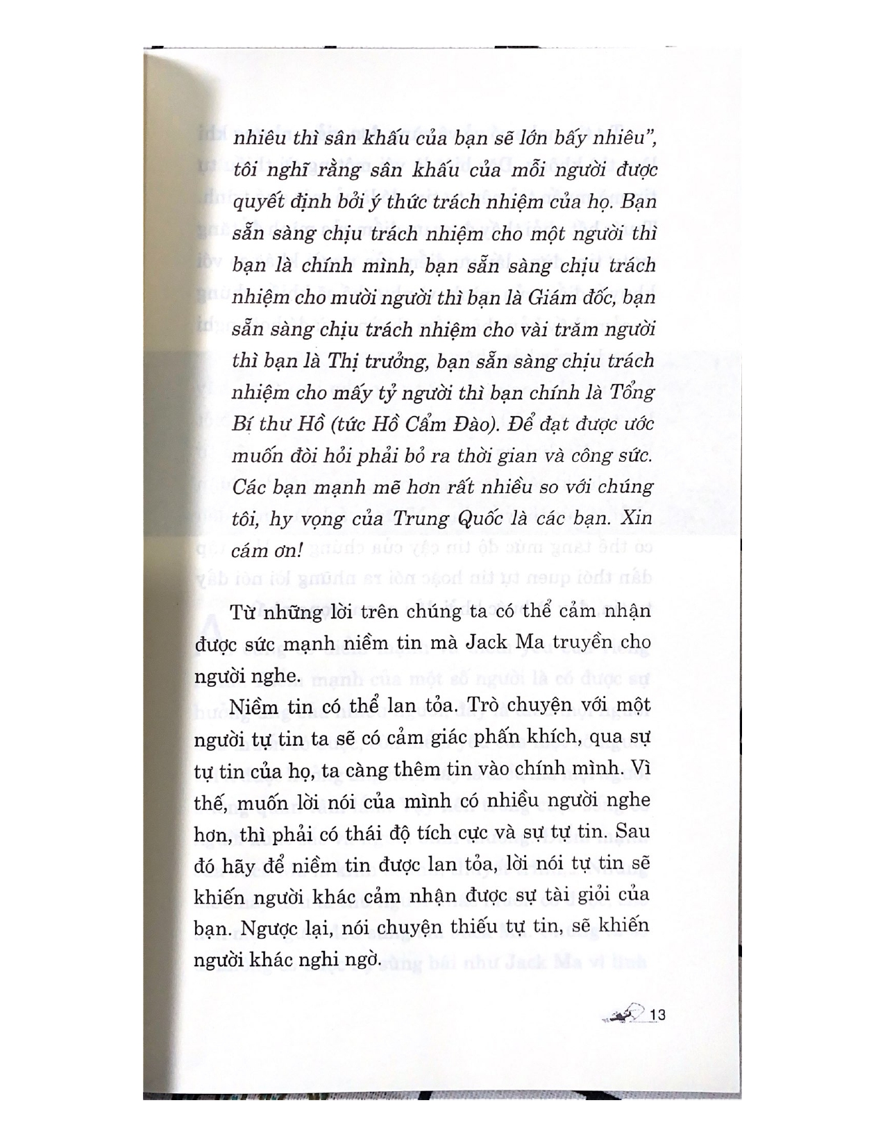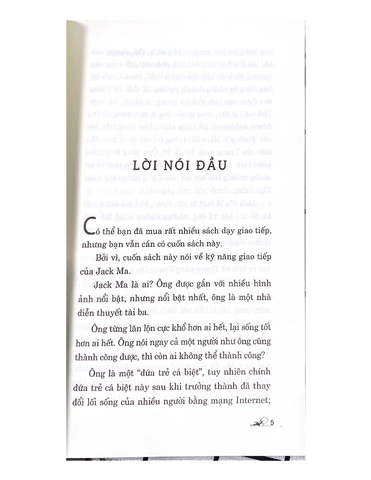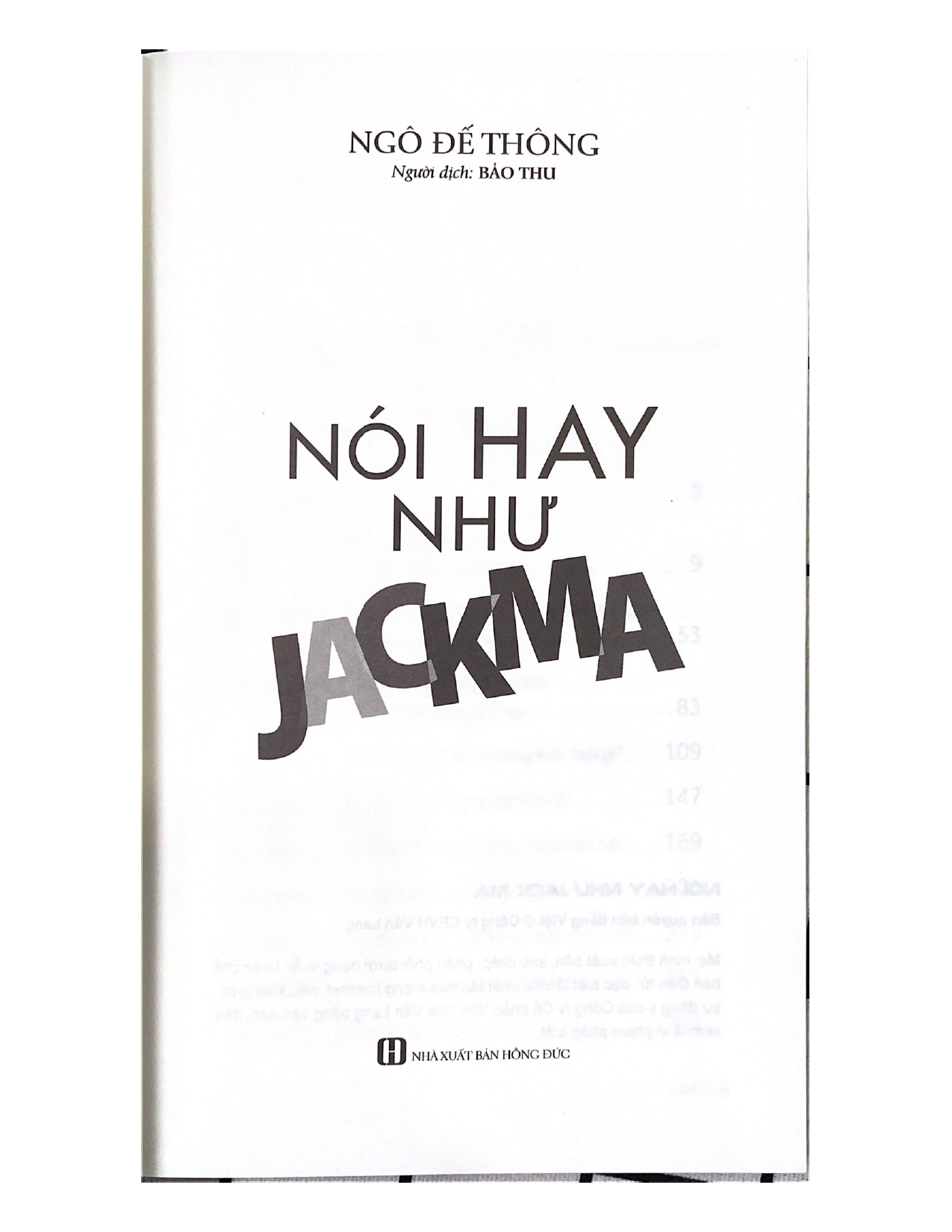 Nói Hay Như Jack Ma"Hầu như những ai từng nghe Jack Ma diễn thuyết đều có cùng cảm nhận rằng ông giống như nhà ảo thuật ngôn ngữ. Lời nói của ông cứng rắn nhưng thuyết phục, giản dị nhưng sâu sắc; hài hước nhưng không nông cạn, sắc bén nhưng lại không chua ngoa. Jack Ma giỏi tự chế nhạo, nhưng qua đó có thể thấy được đẳng cấp của ông; Jack Ma giỏi châm biếm, nhưng trong lời châm biếm lại mang ý chỉ bảo. Đây chính là sức lôi cuốn của Jack Ma, sức hút của một con người có tài ăn nói vượt trội.