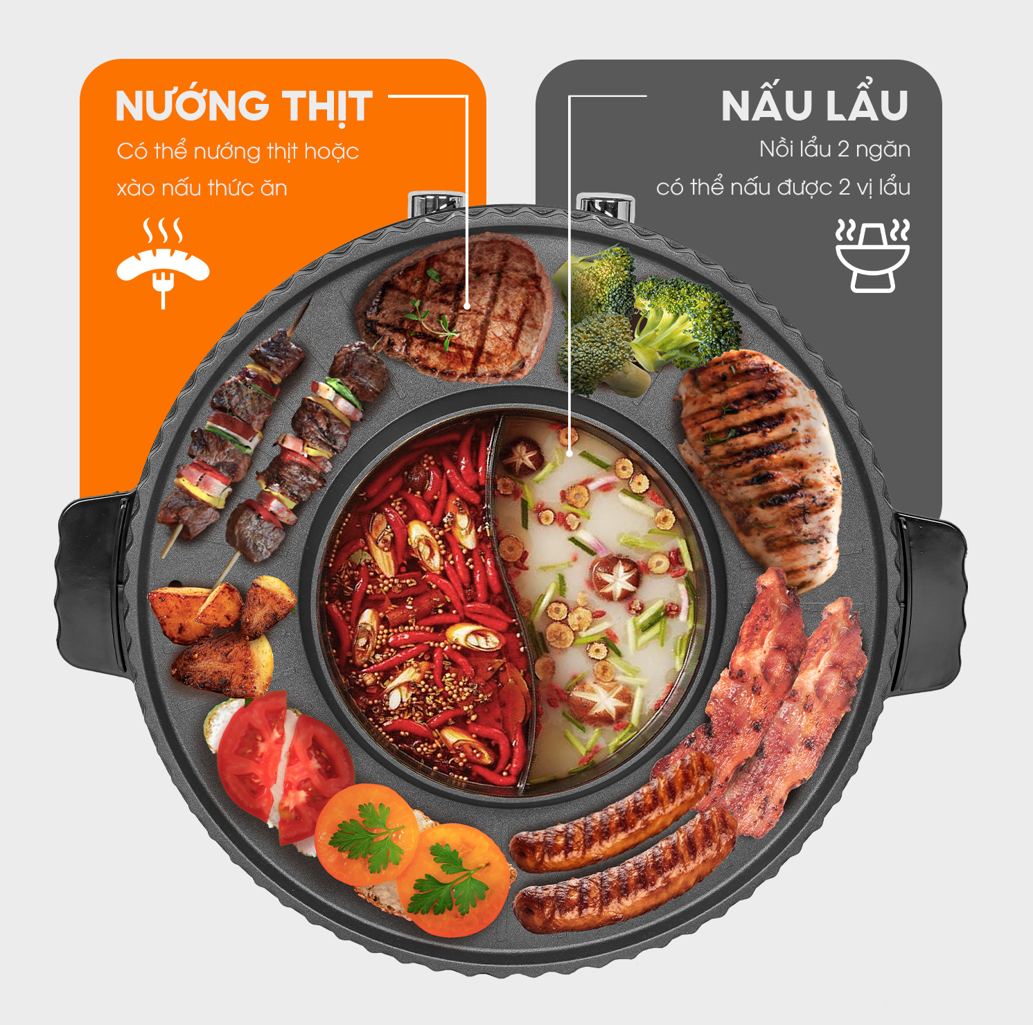 Nồi lẩu nướng điện đa năng 2 trong 1, nướng siêu chống dính cùng với lẩu 2 ngăn tiện lợi
