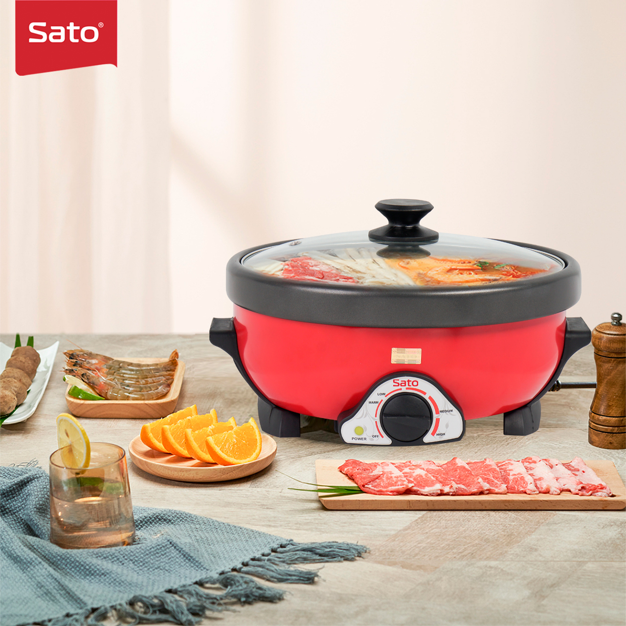 - Nồi Lẩu Điện SATO ST-351HP (3.5L) - Đỏ dùng để nấu lẩu, chiên, xào, rim và nấu canh, giúp bạn bổ sung nhiều món ngon vào thực đơn của gia đình. - Lòng nồi được làm từ nhôm
