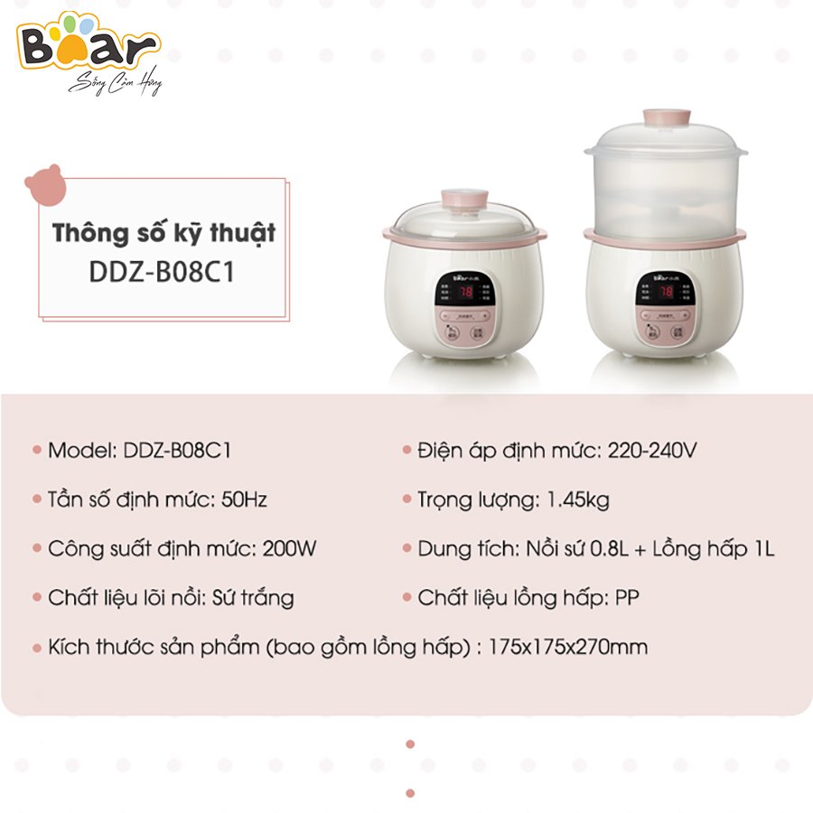 - Thông số kỹ thuật của nồi nấu chậm Bear 0.8L SUBE001 Thương hiệu Bear Mã sản phẩm SUBE001 Tên sản phẩm Nồi nấu chậm 0.8L Bear SUBE001 Dung tích 0.8 lít Công suất 200W