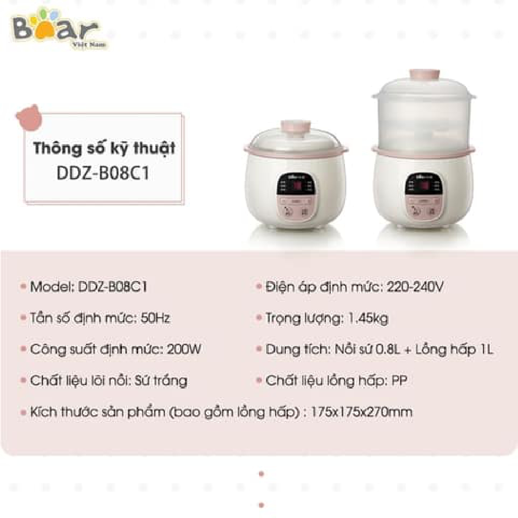 - Đa dạng dung tích sử dụng THÔNG SỐ KỸ THUẬT Tên sản phẩm: Nồi nấu chậm 0.8L Bear DDZ-B08C1 (SUBE001) Hàng Quốc Tế Hãng: Bear Model: SUBE001 Dung tích: 0.8L Công suất: 200W Điện áp: 220V~50Hz Chất liệu: Lõi sứ, lồng hấp PP Màu sắc: Hồng/vàng Trọng lượng: 1.45Kg Kích thước: 175 x 175 x 270mm