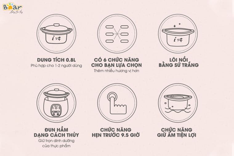 Đặc biệt, nồi nấu chậm Bear bản quốc tế loại 0,8 lít còn được tích hợp đến 6 chức năng nấu thông minh: nấu cháo, hầm canh, hấp/luộc, hầm tổ yến, nấu chè và chế độ nấu tự động. Chỉ với một em nồi nhỏ gọn này bạn có thể chế biến đồ ăn cho bé theo nhiều kiểu khác nhau hoặc làm các món ăn khác trong gia đình vẫn vô cùng tiện lợi.