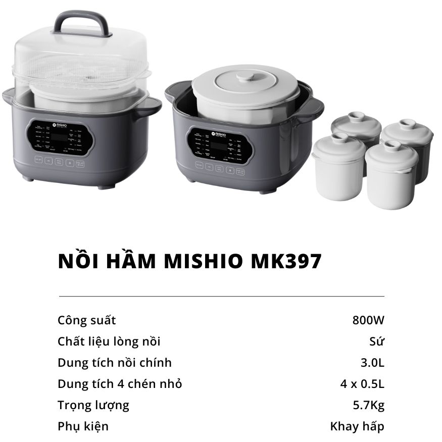 Khó khăn khi chế biến nhiều món cùng lúc Khi phải chuẩn bị bữa ăn với nhiều món như kho thịt, nấu cháo, hấp rau củ, bạn có thể cảm thấy mệt mỏi vì phải sử dụng nhiều dụng cụ nấu và mất thời gian dọn dẹp. Bộ 4 thố sứ 300ml đi kèm của Mishio MK397 cho phép bạn chế biến nhiều món một cách linh hoạt, từ hầm xương, chưng yến, nấu chè đến hấp rau củ, tất cả chỉ trong một thiết bị. Đặc điểm nổi bật của nồi hầm Mishio MK397